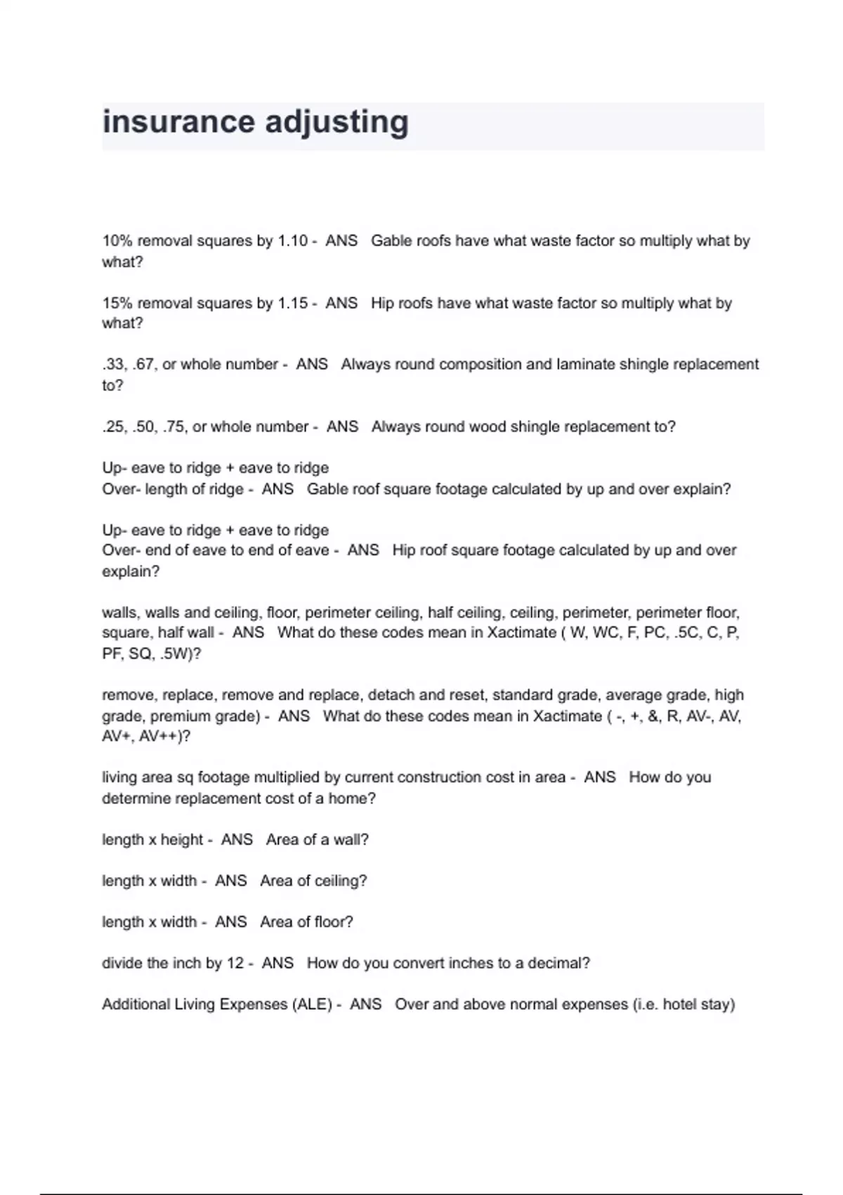 Insurance Adjusting Exam Questions And Answers 10% removal squares by 1.10 - ANS Gable roofs have what waste factor so multiply what by what? 15% removal squares by 1.15 - ANS Hip roofs have what waste factor so multiply what by what? .33, .67, or whole number - ANS Always round composition and laminate shingle replacement to? .25, .50, .75, or whole number - ANS Always round wood shingle replacement to? Up- eave to ridge + eave to ridge Over- length of ridge - ANS Gable roof square footage calculated by up and over explain? Up- eave to ridge + eave to ridge Over- end of eave to end of eave - ANS Hip roof square footage calculated by up and over explain? walls, walls and ceiling, floor, perimeter ceiling, half ceiling, ceiling, perimeter, perimeter floor, square, half wall - ANS What do these codes mean in Xactimate ( W, WC, F, PC, .5C, C, P, PF, SQ, .5W)? remove, replace, remove and replace, detach and reset, standard grade, average grade, high grade, premium grade) - ANS What do these codes mean in Xactimate ( -, +, &, R, AV-, AV, AV+, AV++)? living area sq footage multiplied by current construction cost in area - ANS How do you determine replacement cost of a home?
