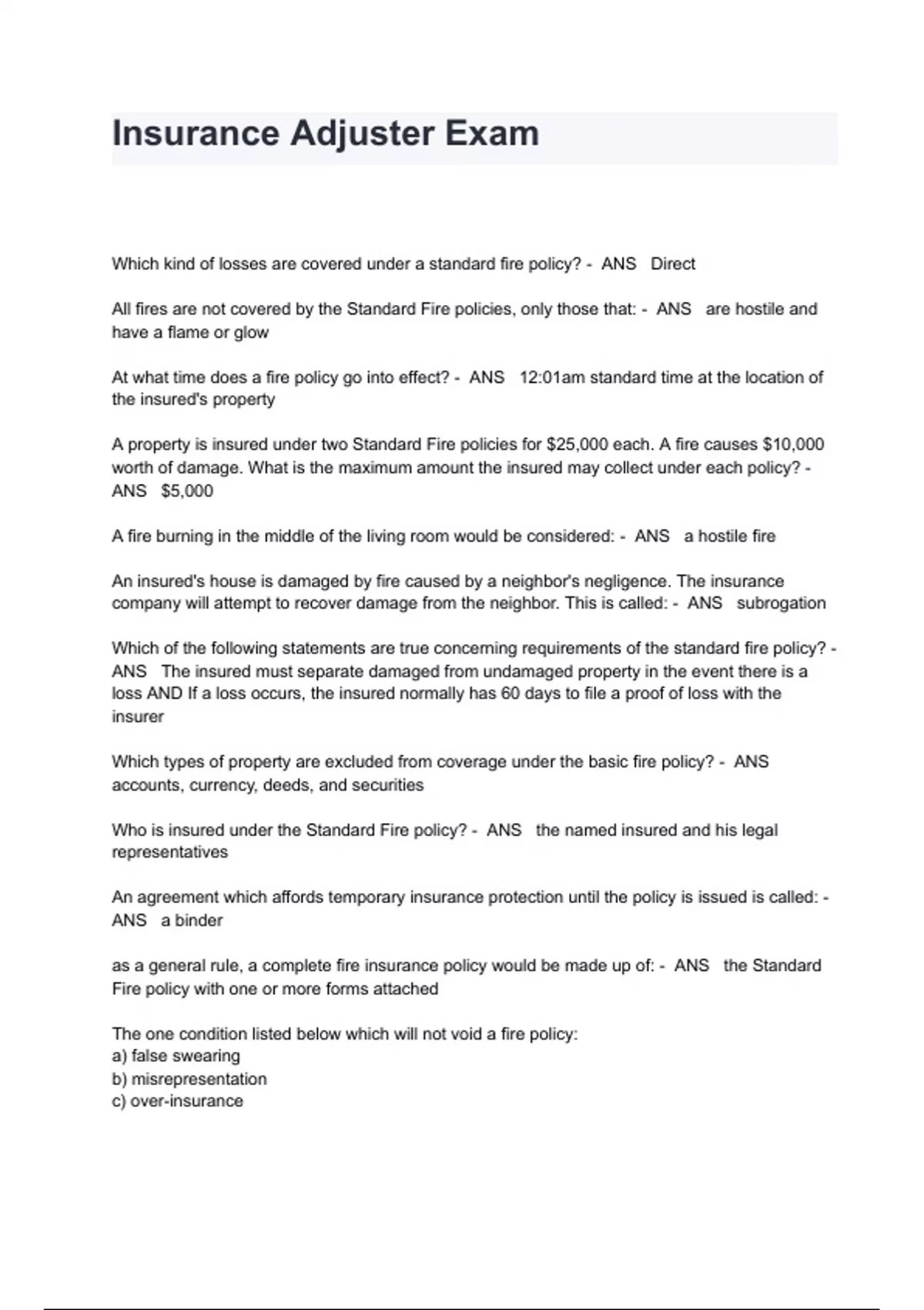 Insurance Adjuster Exam Questions And Answers Which kind of losses are covered under a standard fire policy? - ANS Direct All fires are not covered by the Standard Fire policies, only those that: - ANS are hostile and have a flame or glow At what time does a fire policy go into effect? - ANS 12:01am standard time at the location of the insured's property A property is insured under two Standard Fire policies for $25,000 each. A fire causes $10,000 worth of damage. What is the maximum amount the insured may collect under each policy? - ANS $5,000 A fire burning in the middle of the living room would be considered: - ANS a hostile fire An insured's house is damaged by fire caused by a neighbor's negligence. The insurance company will attempt to recover damage from the neighbor. This is called: - ANS subrogation Which of the following statements are true concerning requirements of the standard fire policy? - ANS The insured must separate damaged from undamaged property in the event there is a loss AND If a loss occurs, the insured normally has 60 days to file a proof of loss with the insurer Which types of property are excluded from coverage under the basic fire policy? - ANS accounts, currency, deeds, and securities Who is insured under the Standard Fire policy? - ANS the named insured and his legal representatives An agreement which affords temporary insurance protection until the policy is issued is called: - ANS a binder as a general rule, a complete fire insurance policy would be made up of: - ANS the Standard Fire policy with one or more forms attached The one condition listed below which will not void a fire policy: a) false swearing b) misrepresentation c) over-insurance