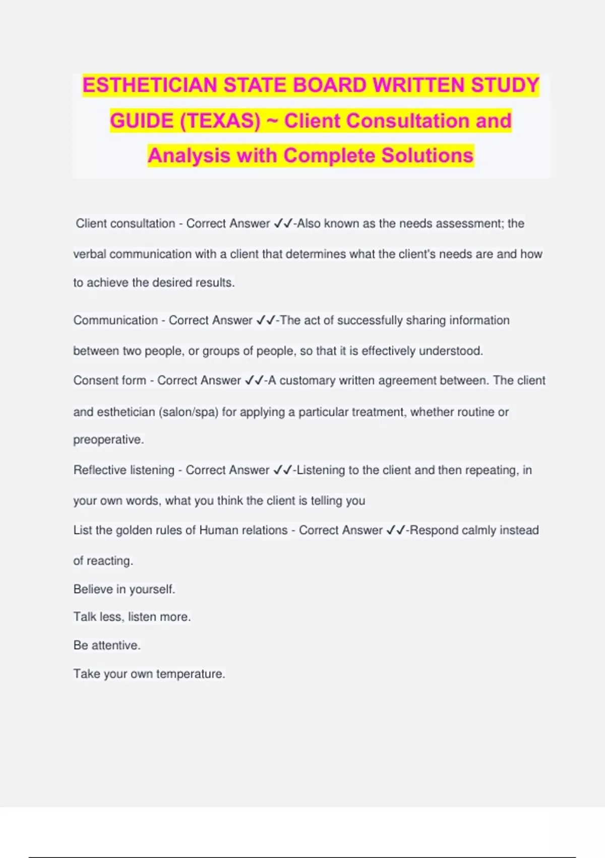ESTHETICIAN STATE BOARD WRITTEN STUDY GUIDE (TEXAS) ~ Client Consultation and Analysis with Complete Solutions Client consultation - Correct Answer ️️ -Also known as the needs assessment; the verbal communication with a client that determines what the client's needs are and how to achieve the desired results. Communication - Correct Answer ️️ -The act of successfully sharing information between two people, or groups of people, so that it is effectively understood. Consent form - Correct Answer ️️ -A customary written agreement between. The client and esthetician (salon/spa) for applying a particular treatment, whether routine or preoperative. Reflective listening - Correct Answer ️️ -Listening to the client and then repeating, in your own words, what you think the client is telling you List the golden rules of Human relations - Correct Answer ️️ -Respond calmly instead of reacting. Believe in yourself. Talk less, listen more. Be attentive. Take your own temperature. How should you prepare for a client consultation? - Correct Answer ️️ -Have a pen and intake form along with vendor supplied or salon manufactured pamphlets, photos, articles, or clinical research papers will help you to prevent the services or explain the benefits of certain ingredients that will be used to perform a treatment. List and describe the 10 elements of a successful client consultation. - Correct Answer ️️ -Review the intake form that your client filled out, take a few minutes to develop rapport with the client and get the consultation going. Assess your clients current goals and objectives. Preference, ask what products your client is currently using. Analyze, use a magnifying loupe and/or wood's lamp to asses the client's skin. Lifestyle, ask your client about her career and personal lifestyle. Show and tell, review the various treatment options. Suggest, once you have enough information to make valid suggestions, narrow the treatment options based on the following:lifestyle, skin type, skin conditions, Fitzpatrick typing. Sun exposure, maintenance, repeat. Name some types of information that should go on a client consultation card. - Correct Answer ️️ -Primary reason for visit? Have you had a facial before? Name. Emergency contact/Dr. How should you handle tardy clients? - Correct Answer ️️ -Set a limited amount to of time they allow clients to be late before they require them to reschedule. (15 mins mostly) How should you handle scheduling messup - Correct Answer ️️ -Be polite and never argue about who is correct. It's about preserving your relationship with your client. How should you handle an unhappy client? - Correct Answer ️️ -Express your most sincere apology. Give client opportunity to vent. A follow-up note with a gift certificate or special offer. Keep emotions in check. Don't hesitate to call spa director, front desk manager, or senior staff member. May be easier for her to deal with someone else. List at least 5 things to remember when communicating with your coworkers. - Correct Answer ️️ -Treat everyone with respect. Remain objective. Be honest and sensitive. Remain neutral. Keep private life private List at least 4 guidelines for communicating with salon managers. - Correct Answer ️️ - Get your facts straight. Be open and honest. Check your attitude. Be open to constructive criticism. Communicating - Correct Answer ️️ -In the field of cosmo, we are expected to interac