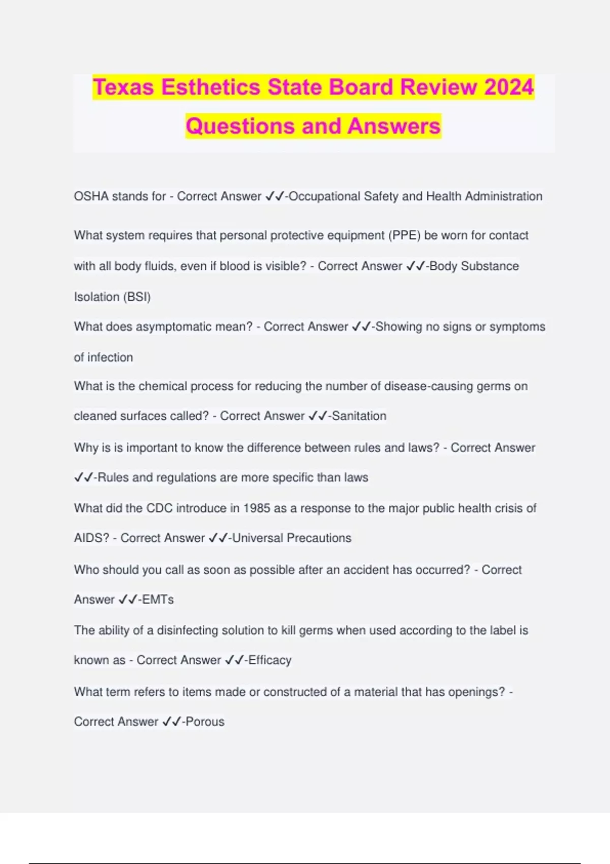 Texas Esthetics State Board Review 2024 Questions and Answers OSHA stands for - Correct Answer ️️ -Occupational Safety and Health Administration What system requires that personal protective equipment (PPE) be worn for contact with all body fluids, even if blood is visible? - Correct Answer ️️ -Body Substance Isolation (BSI) What does asymptomatic mean? - Correct Answer ️️ -Showing no signs or symptoms of infection What is the chemical process for reducing the number of disease-causing germs on cleaned surfaces called? - Correct Answer ️️ -Sanitation Why is is important to know the difference between rules and laws? - Correct Answer ️️ -Rules and regulations are more specific than laws What did the CDC introduce in 1985 as a response to the major public health crisis of AIDS? - Correct Answer ️️ -Universal Precautions Who should you call as soon as possible after an accident has occurred? - Correct Answer ️️ -EMTs The ability of a disinfecting solution to kill germs when used according to the label is known as - Correct Answer ️️ -Efficacy What term refers to items made or constructed of a material that has openings? - Correct Answer ️️ -Porous What replaced the Universal Precautions in 1996? - Correct Answer ️️ -Standard Precations What is mycobacterium fortuitum? - Correct Answer ️️ -A microscopic germ that normally exists in tap water in small numbers Natural immunity is resistance to disease that is - Correct Answer ️️ -Partly inherited and partly developed through healthy living Standard Precautions (SP) apply to all body fluids and secretions except what? - Correct Answer ️️ -Sweat What is the correct term for disease-causing microorganisms carried in the body by blood? - Correct Answer ️️ -Bloodborne pathogens What is the basic assumption underlying Standard Precautions (SP)? - Correct Answer ️️ -All body fluids are potential sources of infection What term refers to the ability of the body to destroy and resist infection? - Correct Answer ️️ -Immunity What is the term for pus-forming bacteria that grow in clusters like a bunch of grapes? - Correct Answer ️️ -Staphylococci What is the term for slender, hair-like extensions used by bacilli and spirilia for locomotion? - Correct Answer ️️ -Flagella What is efficacy? - Correct Answer ️️ -Ability to produce an effect What is a type of infectious bacteria that is highly resistant to conventional treatments such as antibiotics? - Correct Answer ️️ -Methicillin-resistant staphylococcus aureus What does bactericidal mean? - Correct Answer ️️ -Capable of destroying bacteria What is tinea barbae? - Correct Answer ️️ -Superficial fungal infections that commonly affects the skin What is bioburden? - Correct Answer ️️ -The number of viable organisms in or on an object or surface What does virucidal mean? - Correct Answer ️️ -Capable of destroying viruses Quat is disinfectant known as - Correct Answer ️️ -Quaternary Ammonium Compounds Another name for sodium hypochlorite is - Correct Answer ️️ -Household bleach Pus-forming bacteria that grow in curved lines resembling a string of beans are known as - Correct Answer ️️ -Streptococci Local infection is what? - Correct Answer ️️ -Pimple or abscess State registers Environmental Protection Agency (EPA) is a type of - Correct Answer ️️ -Disinfectant What bacteria is responsible for food poising and toxic shock syndrome? - Correct Answer ️️ -Staphylococci