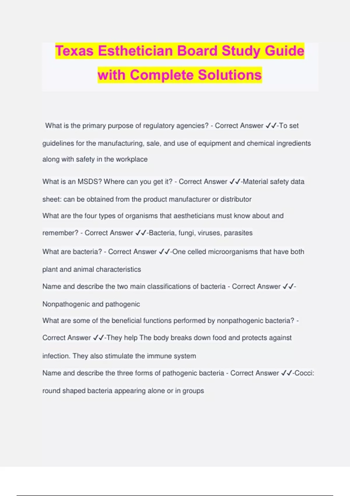 Texas Esthetician Board Study Guide with Complete Solutions What is the primary purpose of regulatory agencies? - Correct Answer ️️ -To set guidelines for the manufacturing, sale, and use of equipment and chemical ingredients along with safety in the workplace What is an MSDS? Where can you get it? - Correct Answer ️️ -Material safety data sheet: can be obtained from the product manufacturer or distributor What are the four types of organisms that aestheticians must know about and remember? - Correct Answer ️️ -Bacteria, fungi, viruses, parasites What are bacteria? - Correct Answer ️️ -One celled microorganisms that have both plant and animal characteristics Name and describe the two main classifications of bacteria - Correct Answer ️️ - Nonpathogenic and pathogenic What are some of the beneficial functions performed by nonpathogenic bacteria? - Correct Answer ️️ -They help The body breaks down food and protects against infection. They also stimulate the immune system Name and describe the three forms of pathogenic bacteria - Correct Answer ️️ -Cocci: round shaped bacteria appearing alone or in groups Bacilli: short rod shaped bacteria- the most common type of bacteria producing diseases such as tetanus, typhoid, tuberculosis, and diptheria Spirilla: spiral or corkscrew shaped bacteria- subdivide into groups which cause syphilis STDs and Lyme disease What is a contagious disease? - Correct Answer ️️ -When a disease spreads from one person to another person Is HIV a risk in the salon or spa why or why not? - Correct Answer ️️ -Yes it can be transmitted through performing facial treatments, extractions, micro dermabrasion in, peels, or working with post operative patients; whenever the skin is broken. What is the difference between cleaning disinfecting and sterilizing? - Correct Answer ️️ -Cleaning is the process of removing all visible dirt and debris from tools by washing with liquid soap and warm water. Disinfectants are products that destroy all bacteria fungi and viruses but not spores. Sterilization is the process that completely destroys all microbial life including spores commonly done with high-pressure steam equipment called autoclaves. What is complete immersion? - Correct Answer ️️ -To submerge an implement for 10 minutes How do you know if an item can be disinfected? - Correct Answer ️️ -If it is a non- porous surfaced reusable item Can porous items be disinfected? - Correct Answer ️️ -No (disposable items) How often should disinfectant solutions be changed? how often should an AHP disinfectant be changed? - Correct Answer ️️ -Daily or by the instructions on the label What are universal precautions? - Correct Answer ️️ -Guidelines to prevent the spread of diseases- called for the use of gloves any time blood was present/visible What are standard precautions? - Correct Answer ️️ -Replaced universal precautions - called for the use of gloves any time there was a chance blood could be present even if not visible What is an exposure incident? - Correct Answer ️️ -Contact with broken skin, blood, body fluid, or other potentially infectious materials that is the result of the performance of an employee's duties