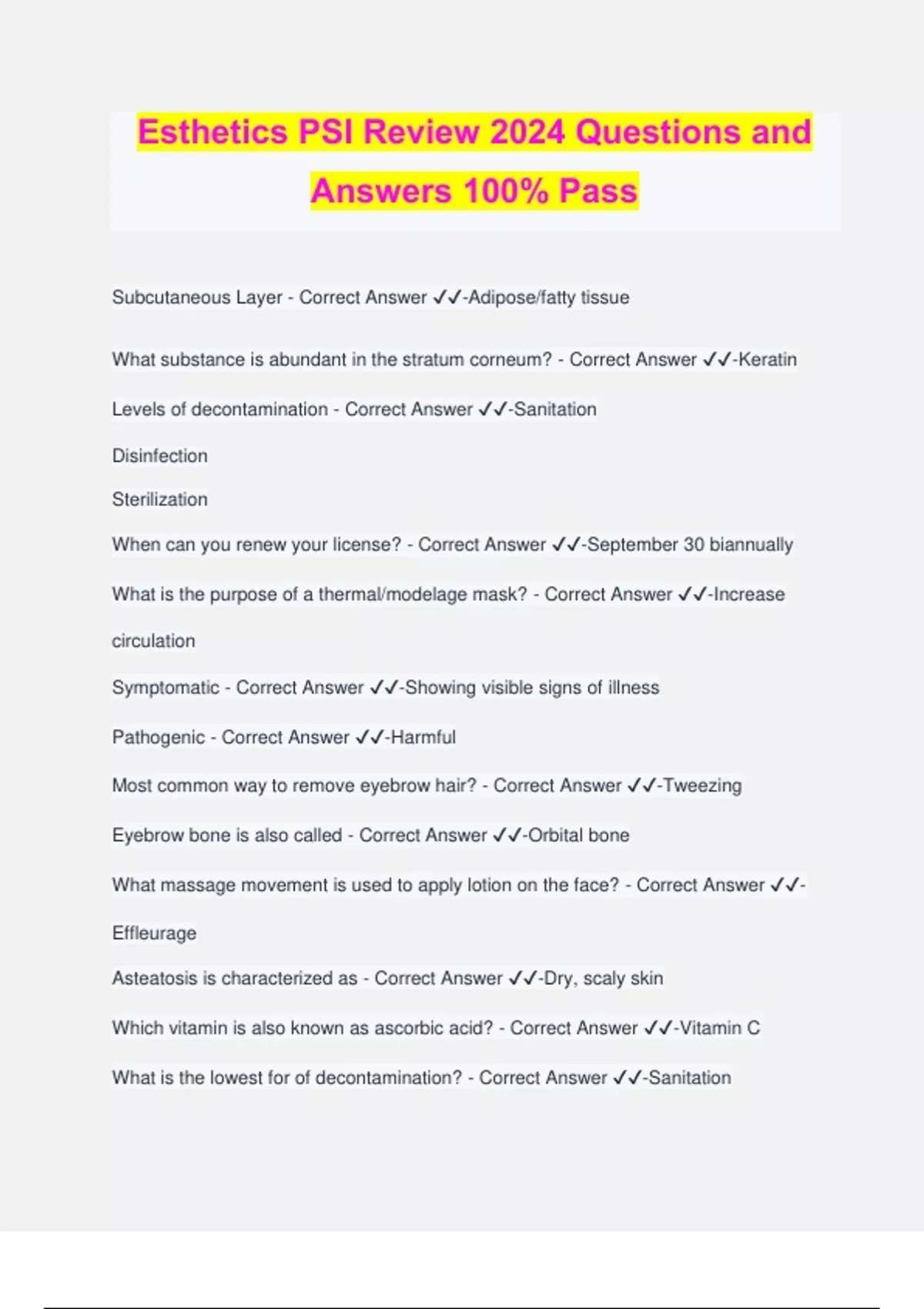 Esthetics PSI Review 2024 Questions and Answers 100% Pass Subcutaneous Layer - Correct Answer ️️ -Adipose/fatty tissue What substance is abundant in the stratum corneum? - Correct Answer ️️ -Keratin Levels of decontamination - Correct Answer ️️ -Sanitation Disinfection Sterilization When can you renew your license? - Correct Answer ️️ -September 30 biannually What is the purpose of a thermal/modelage mask? - Correct Answer ️️ -Increase circulation Symptomatic - Correct Answer ️️ -Showing visible signs of illness Pathogenic - Correct Answer ️️ -Harmful Most common way to remove eyebrow hair? - Correct Answer ️️ -Tweezing Eyebrow bone is also called - Correct Answer ️️ -Orbital bone What massage movement is used to apply lotion on the face? - Correct Answer ️️ - Effleurage Asteatosis is characterized as - Correct Answer ️️ -Dry, scaly skin Which vitamin is also known as ascorbic acid? - Correct Answer ️️ -Vitamin C What is the lowest for of decontamination? - Correct Answer ️️ -Sanitation Minimum time for disinfectant? - Correct Answer ️️ -10 minutes Psoriasis is characterized as - Correct Answer ️️ -silver scales The main factor towards aging? - Correct Answer ️️ -Sun damage/exposure Which condition do you not use the vacuum? - Correct Answer ️️ -Rosacea What is the best lighting for makeup application? - Correct Answer ️️ -Natural lighting When contour you are trying to make the illusion of which face? - Correct Answer ️️ - An oval face shape Which skin type do you not use a clay mask on? - Correct Answer ️️ -Extremely dry skin What is an example of a fissure? - Correct Answer ️️ -Chapped lips An odorless and fast acting EPA registered disinfectant is - Correct Answer ️️ - Quaternary Ammonium compound How would you correct a thin upper lip? - Correct Answer ️️ -Line slightly outside the upper lip How would you correct a narrow jawline? - Correct Answer ️️ -Highlight When waxing eyebrows how would you remove the wax? - Correct Answer ️️ - Opposite of hair growth What are the primary colors? - Correct Answer ️️ -Blue, red, and yellow What is hair removal from the follicle? - Correct Answer ️️ -Epilation How would you correct ruddy skin? - Correct Answer ️️ -Use a green tinted concealer Which division does the State Board of Cosmetology and Hairstyling fall under? - Correct Answer ️️ -Division of Consumer Affairs What is on the MSDS? - Correct Answer ️️ -Safely handling procedures Massage movement that is also known as kneading? - Correct Answer ️️ -Petrissage The massage movement that is also known as tapping or percussion? - Correct Answer ️️ -Tapotement What is the primary benefit of tapotement? - Correct Answer ️️ -Stimulation You should never wax over what? - Correct Answer ️️ -Moles and abrasions Which lesion is characterized as a colored mark on the skin? - Correct Answer ️️ - Macule Which system is responsible for providing nutrients to the blood? - Correct Answer ️️ - Circulatory system Which system includes the hair, nails and skin? - Correct Answer ️️ -Integumentary system Which machine uses negative and positive poles? - Correct Answer ️️ -Glavanic What is the range of the pH scale? - Correct Answer ️️ -0-14