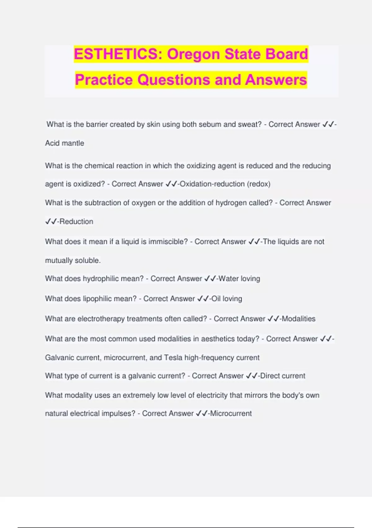 ESTHETICS: Oregon State Board Practice Questions and Answers What is the barrier created by skin using both sebum and sweat? - Correct Answer ️️ - Acid mantle What is the chemical reaction in which the oxidizing agent is reduced and the reducing agent is oxidized? - Correct Answer ️️ -Oxidation-reduction (redox) What is the subtraction of oxygen or the addition of hydrogen called? - Correct Answer ️️ -Reduction What does it mean if a liquid is immiscible? - Correct Answer ️️ -The liquids are not mutually soluble. What does hydrophilic mean? - Correct Answer ️️ -Water loving What does lipophilic mean? - Correct Answer ️️ -Oil loving What are electrotherapy treatments often called? - Correct Answer ️️ -Modalities What are the most common used modalities in aesthetics today? - Correct Answer ️️ - Galvanic current, microcurrent, and Tesla high-frequency current What type of current is a galvanic current? - Correct Answer ️️ -Direct current What modality uses an extremely low level of electricity that mirrors the body's own natural electrical impulses? - Correct Answer ️️ -Microcurrent Cataphoresis: Effects of Galvanic Current - Correct Answer ️️ -Produces acidic reactions Closes the pores Soothes the nerves Decreases blood supply Contracts blood vessels Hardens and firms tissues Anaphoresis: Effects of Galvanic Current - Correct Answer ️️ -Produces alkaline reactions Open the pores Stimulate and irritate the nerves Increases blood supply Expands blood vessels Softens tissues Effects of Microcurrent - Correct Answer ️️ -Improve blood and lymph circulation Produces acidic and alkaline reaction opens and closes hair follicles and pores Increases muscle tone Restores elasticity Reduces redness and inflammation Minimizes healing time in acne lesions enter improved barrier function of the skin Increases metabolism What is another name for Tesla high frequency current? - Correct Answer ️️ -Violet ray What is the thermal or heat producing current with a high rate of oscillation or vibration? - Correct Answer ️️ -Tesla high frequency current Effects of Tesla high-frequency current - Correct Answer ️️ -Stimulates blood circulation Increases elimination and absorption Increases metabolism Improves germicidal action Relieve congestion What are the three types of electromagnetic energy? - Correct Answer ️️ -Visible light, invisible infrared light, and invisible ultraviolet radiation What does laser stand for? - Correct Answer ️️ -Light amplification stimulation emission of radiation