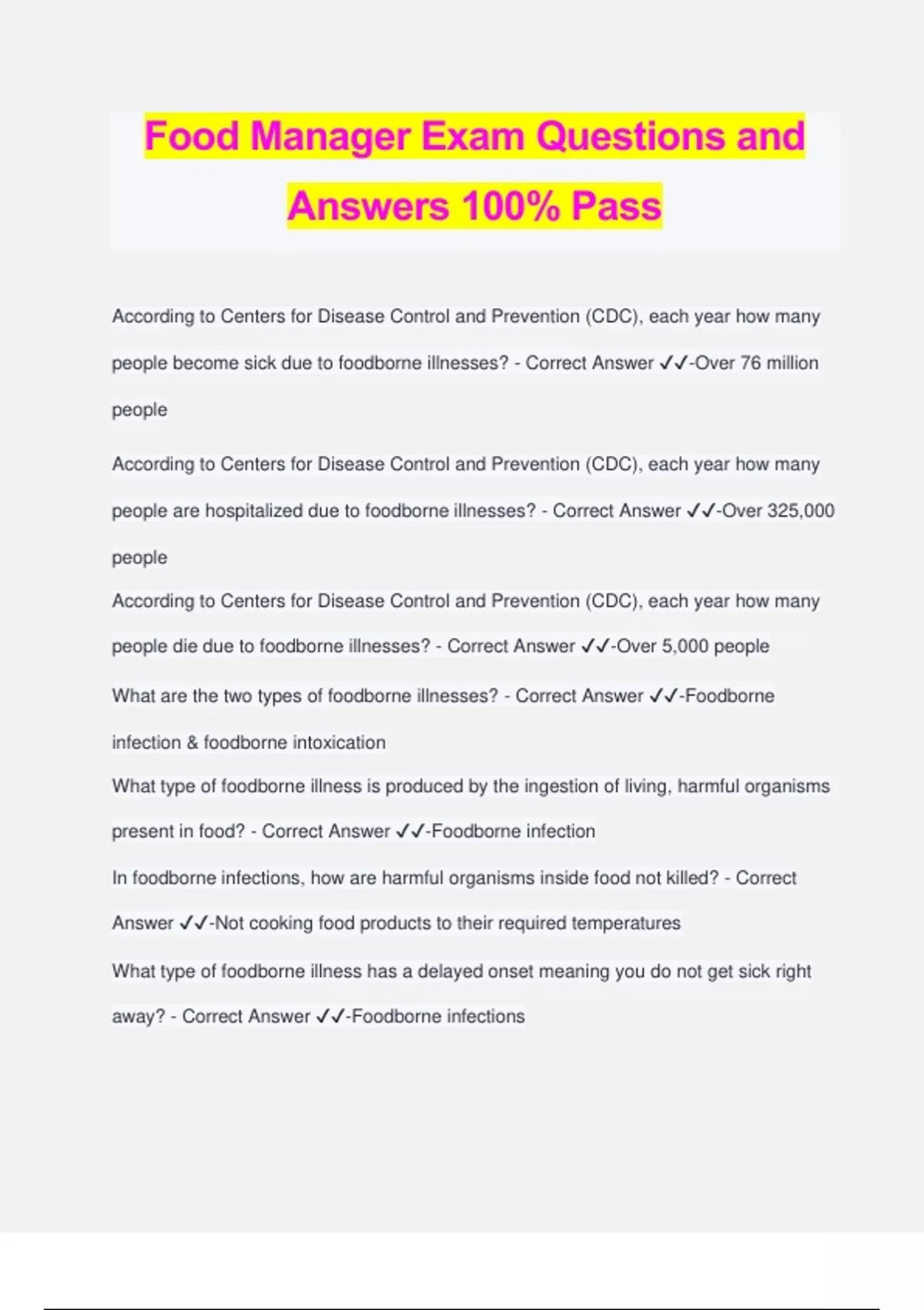 Food Manager Exam Questions and Answers 100% Pass According to Centers for Disease Control and Prevention (CDC), each year how many people become sick due to foodborne illnesses? - Correct Answer ️️ -Over 76 million people According to Centers for Disease Control and Prevention (CDC), each year how many people are hospitalized due to foodborne illnesses? - Correct Answer ️️ -Over 325,000 people According to Centers for Disease Control and Prevention (CDC), each year how many people die due to foodborne illnesses? - Correct Answer ️️ -Over 5,000 people What are the two types of foodborne illnesses? - Correct Answer ️️ -Foodborne infection & foodborne intoxication What type of foodborne illness is produced by the ingestion of living, harmful organisms present in food? - Correct Answer ️️ -Foodborne infection In foodborne infections, how are harmful organisms inside food not killed? - Correct Answer ️️ -Not cooking food products to their required temperatures What type of foodborne illness has a delayed onset meaning you do not get sick right away? - Correct Answer ️️ -Foodborne infections What are two bacteria most associated with foodborne infection? - Correct Answer ️️ - Salmonella and E. Coli What type of foodborne illness is produced by ingestion of bacterial toxins or excrements that are present in food before it is consumed? - Correct Answer ️️ - Foodborne intoxication What type of foodborne illness may occur from consuming foods that contain chemicals from cleaning agents, pesticides, or certain metals? - Correct Answer ️️ -Foodborne intoxication What type of foodborne illness may occur when leaving potentially hazardous food products at room temperature, exposing it to the Temperature Danger Zone (TDZ)? - Correct Answer ️️ -Foodborne intoxication What are waste or by-products of bacteria? - Correct Answer ️️ -Toxins The symptoms of what type of foodborne illness have a rapid onset, meaning they occur rapidly within a few hours? - Correct Answer ️️ -Foodborne intoxication What are the two bacteria associated with foodborne intoxication? - Correct Answer ️️ -Staphylococcus Aureus and Clostridium Botulinum Poultry should be cooked to an internal temperature of how many degrees and for how many seconds? - Correct Answer ️️ -165 degrees F for 15 seconds Ground beef should be cooked to an internal temperature of how many degrees for how many seconds? - Correct Answer ️️ -155 degrees F for 15 seconds Pork should be cooked to an internal temperature of how many degrees for how many seconds? - Correct Answer ️️ -145 degrees for 15 seconds What is WRSA? - Correct Answer ️️ -Wash, Rinse, Sanitize, Air dry How many seconds do food preparers need to wash their hands for? - Correct Answer ️️ -20 seconds What are the four groups of people who are considered High Risk Populations? - Correct Answer ️️ -PIES (Pregnant, infants, elderly, people with impaired immune systems) How many ounces of seafood and fish can a pregnant woman consume each week? - Correct Answer ️️ -12 ounces What are some foods pregnant women cannot eat? - Correct Answer ️️ -King mackerel, shark, swordfish, hot dogs, luncheon meats, unpasteurized cheeses/milks, liver What are the three dangerous types of bacteria to people with AIDS? - Correct Answer ️️ -Salmonella, campylobacter, and listeria Bacteria doubles every how many minutes? - Correct Answer ️️ -20 minutes Food contact surfaces should be cleaned every how many hours to prevent bacterial build-up on the surfaces? - Correct Answer ️️ -Every four hours