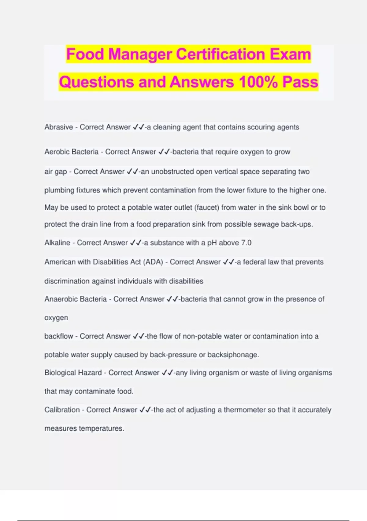 Food Manager Certification Exam Questions and Answers 100% Pass Abrasive - Correct Answer ️️ -a cleaning agent that contains scouring agents Aerobic Bacteria - Correct Answer ️️ -bacteria that require oxygen to grow air gap - Correct Answer ️️ -an unobstructed open vertical space separating two plumbing fixtures which prevent contamination from the lower fixture to the higher one. May be used to protect a potable water outlet (faucet) from water in the sink bowl or to protect the drain line from a food preparation sink from possible sewage back-ups. Alkaline - Correct Answer ️️ -a substance with a pH above 7.0 American with Disabilities Act (ADA) - Correct Answer ️️ -a federal law that prevents discrimination against individuals with disabilities Anaerobic Bacteria - Correct Answer ️️ -bacteria that cannot grow in the presence of oxygen backflow - Correct Answer ️️ -the flow of non-potable water or contamination into a potable water supply caused by back-pressure or backsiphonage. Biological Hazard - Correct Answer ️️ -any living organism or waste of living organisms that may contaminate food. Calibration - Correct Answer ️️ -the act of adjusting a thermometer so that it accurately measures temperatures. Carrier - Correct Answer ️️ -someone who has a pathogenic microorganism in his system or on his person but does not sure signs of the disease. May transmit the pathogen to others and cause disease without necessarily becoming ill himself. Chemical Hazard - Correct Answer ️️ -chemical substances that can contaminate food. Chemical Sanitizing - Correct Answer ️️ -reducing the number of live microorganisms on a surface to safe levels by using chemicals to kill the microorganisms Chlorine - Correct Answer ️️ -the mores commonly used and least expensive chemical sanitizer used in food establishments Ciguatera Toxin - Correct Answer ️️ -a naturally occurring toxin that accumulates in the tissue of certain kinds of predatory reef fish Cleaning - Correct Answer ️️ -the process of removing visible soil from a surface Clean-in-place Equipment - Correct Answer ️️ -equipment that is cleaned and sanitized by passing solutions of detergent, rinse water, sanitizer through the internal components of the equipment. Conditional Employee - Correct Answer ️️ -a potential food employee to whom a job offer is made, conditional on responses to subsequent medical questions or examinations designed to identify potential food employees who may be suffering from a disease that can be transmitted through food and done in compliance with Title 1 of the American with Disabilities Act of 1990. Contamination - Correct Answer ️️ -the presence of harmful substances or organisms in food.