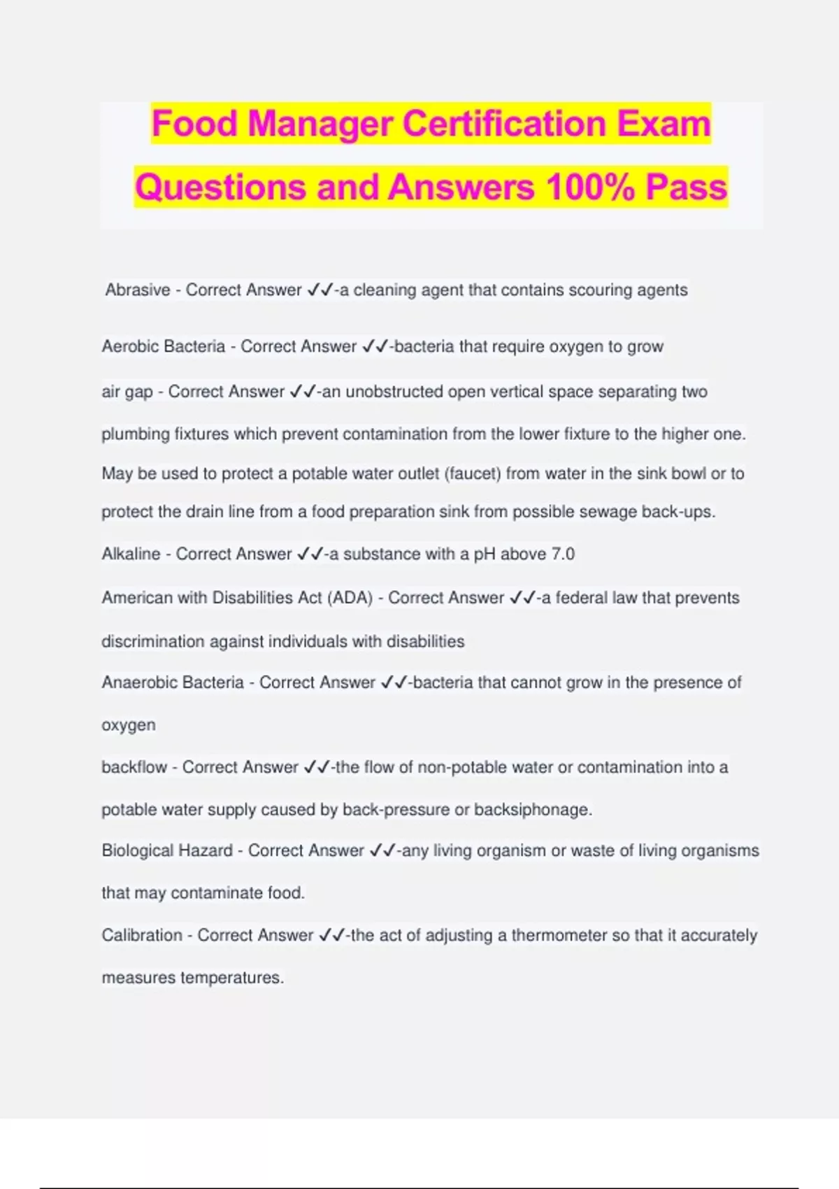 Food Manager Certification Exam Questions and Answers 100% Pass Abrasive - Correct Answer ️️ -a cleaning agent that contains scouring agents Aerobic Bacteria - Correct Answer ️️ -bacteria that require oxygen to grow air gap - Correct Answer ️️ -an unobstructed open vertical space separating two plumbing fixtures which prevent contamination from the lower fixture to the higher one. May be used to protect a potable water outlet (faucet) from water in the sink bowl or to protect the drain line from a food preparation sink from possible sewage back-ups. Alkaline - Correct Answer ️️ -a substance with a pH above 7.0 American with Disabilities Act (ADA) - Correct Answer ️️ -a federal law that prevents discrimination against individuals with disabilities Anaerobic Bacteria - Correct Answer ️️ -bacteria that cannot grow in the presence of oxygen backflow - Correct Answer ️️ -the flow of non-potable water or contamination into a potable water supply caused by back-pressure or backsiphonage. Biological Hazard - Correct Answer ️️ -any living organism or waste of living organisms that may contaminate food. Calibration - Correct Answer ️️ -the act of adjusting a thermometer so that it accurately measures temperatures. Carrier - Correct Answer ️️ -someone who has a pathogenic microorganism in his system or on his person but does not sure signs of the disease. May transmit the pathogen to others and cause disease without necessarily becoming ill himself. Chemical Hazard - Correct Answer ️️ -chemical substances that can contaminate food. Chemical Sanitizing - Correct Answer ️️ -reducing the number of live microorganisms on a surface to safe levels by using chemicals to kill the microorganisms Chlorine - Correct Answer ️️ -the mores commonly used and least expensive chemical sanitizer used in food establishments Ciguatera Toxin - Correct Answer ️️ -a naturally occurring toxin that accumulates in the tissue of certain kinds of predatory reef fish Cleaning - Correct Answer ️️ -the process of removing visible soil from a surface Clean-in-place Equipment - Correct Answer ️️ -equipment that is cleaned and sanitized by passing solutions of detergent, rinse water, sanitizer through the internal components of the equipment. Conditional Employee - Correct Answer ️️ -a potential food employee to whom a job offer is made, conditional on responses to subsequent medical questions or examinations designed to identify potential food employees who may be suffering from a disease that can be transmitted through food and done in compliance with Title 1 of the American with Disabilities Act of 1990. Contamination - Correct Answer ️️ -the presence of harmful substances or organisms in food. Corrective Action - Correct Answer ️️ -action taken when a critical limit is violated in order to protect food safety. Covering - Correct Answer ️️ -a curved, sealed surface that covers the juncture between a flood and the wall. Aids in cleaning and helps prevent insect harborage. Critical Control Points - Correct Answer ️️ -a point during the cooking or precessing of food where steps are taken to reduce or eliminate a food safety hazard. Critical Limit - Correct Answer ️️ -a measurement or observation that separates what is acceptable from what is not acceptable. Cross Connection - Correct Answer ️️ -a physical connection between a potable water system and a source of contamination Cross Contamination - Correct Answer ️️ -when a food item is exposed to a contaminant from another source. Decline Phase - Correct Answer ️️ -when bacteria die off faster than they multiply Degreaser - Correct Answer ️️ -strong detergent that contains a grease-dissolving agent