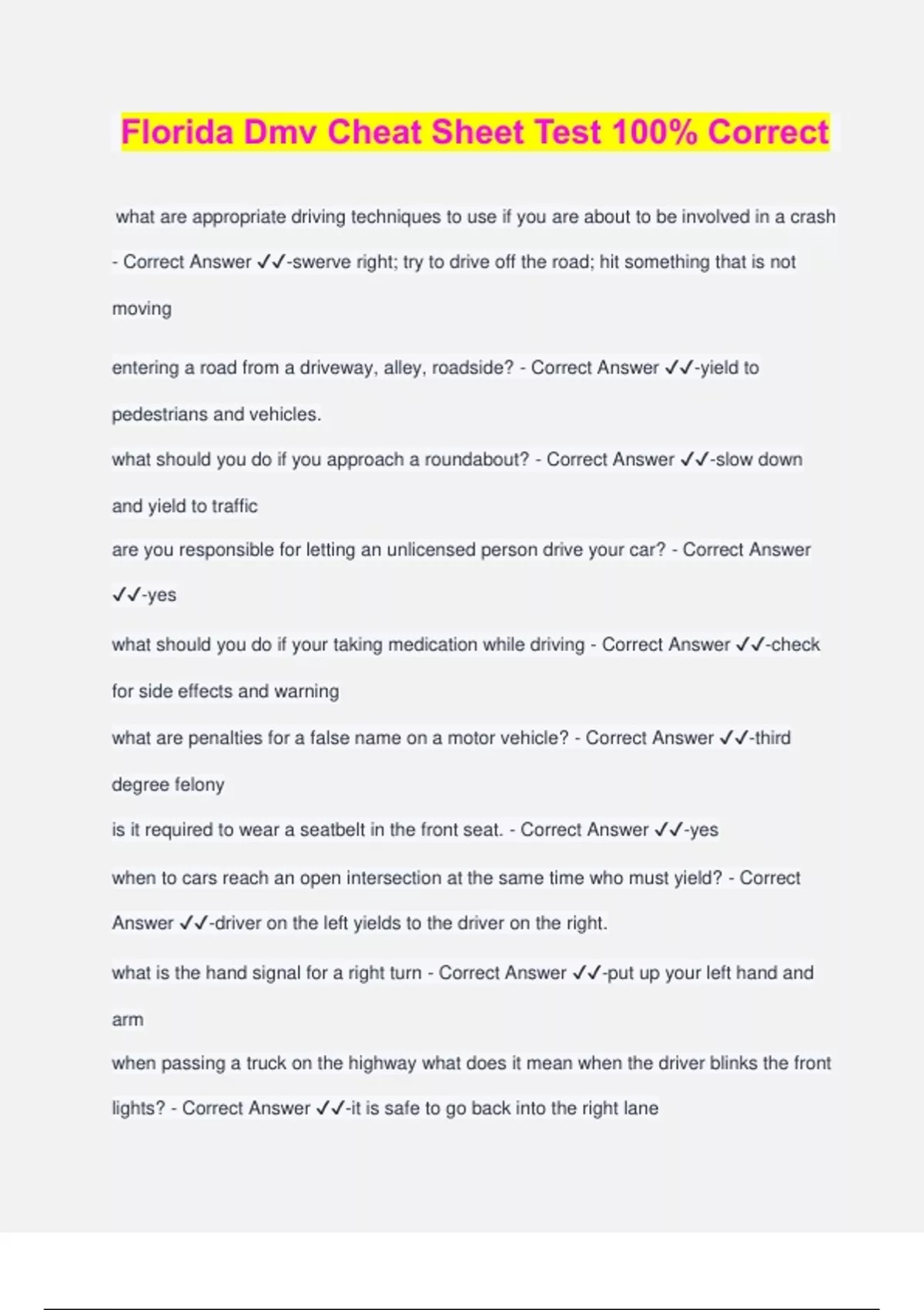 Florida Dmv Cheat Sheet Test 100% Correct what are appropriate driving techniques to use if you are about to be involved in a crash - Correct Answer ️️ -swerve right; try to drive off the road; hit something that is not moving entering a road from a driveway, alley, roadside? - Correct Answer ️️ -yield to pedestrians and vehicles. what should you do if you approach a roundabout? - Correct Answer ️️ -slow down and yield to traffic are you responsible for letting an unlicensed person drive your car? - Correct Answer ️️ -yes what should you do if your taking medication while driving - Correct Answer ️️ -check for side effects and warning what are penalties for a false name on a motor vehicle? - Correct Answer ️️ -third degree felony is it required to wear a seatbelt in the front seat. - Correct Answer ️️ -yes when to cars reach an open intersection at the same time who must yield? - Correct Answer ️️ -driver on the left yields to the driver on the right. what is the hand signal for a right turn - Correct Answer ️️ -put up your left hand and arm when passing a truck on the highway what does it mean when the driver blinks the front lights? - Correct Answer ️️ -it is safe to go back into the right lane 3 parts of the expressway - Correct Answer ️️ -Entrance ramp; acceleration lane; merge lane " 2- second rule" - Correct Answer ️️ -amount of time you should allow between you and another vehicle places your never allowed to park - Correct Answer ️️ -sidewalk; crosswalk; 20 feet of intersection;15 feet of hydrant; bridge or overpass lights required on your car - Correct Answer ️️ -tail lights; headlights; license plate light; break light penalty for 12 points within 12 months of driving - Correct Answer ️️ -30 day suspension fail to answer traffic summons? - Correct Answer ️️ -license may not be renewed what is the 1st thing impaired in a driver who has been drinking alcohol? - Correct Answer ️️ -Judgment when an emergency vehicle approaches from in front or behind what do u do - Correct Answer ️️ -pull over to the right and stop who provides you with a Florida insurance card - Correct Answer ️️ -insurance company what should you do if you hit a parked car? - Correct Answer ️️ -try and find the owner leave contact owner who will be charged with a 15 year old not wearing a seat belt - Correct Answer ️️ -the driver when is it safe to return to the right-hand lane after passing another vehicle - Correct Answer ️️ -when you can see the tires in the rear view mirror what happened to a license driver who was involved in an accident and didn't stop - Correct Answer ️️ -revoked license is it illegal to leave your keys in your car when your parked? - Correct Answer ️️ -yes do you have to drive the speed limit - Correct Answer ️️ -no it just indicates how fast your allowed to go what is the standard speed limit - Correct Answer ️️ -30 standard speed limit for interstates? - Correct Answer ️️ -70 revoking? - Correct Answer ️️ -DUI; 3 cases reckless driving; failure to stop; death; injury; racing on highway