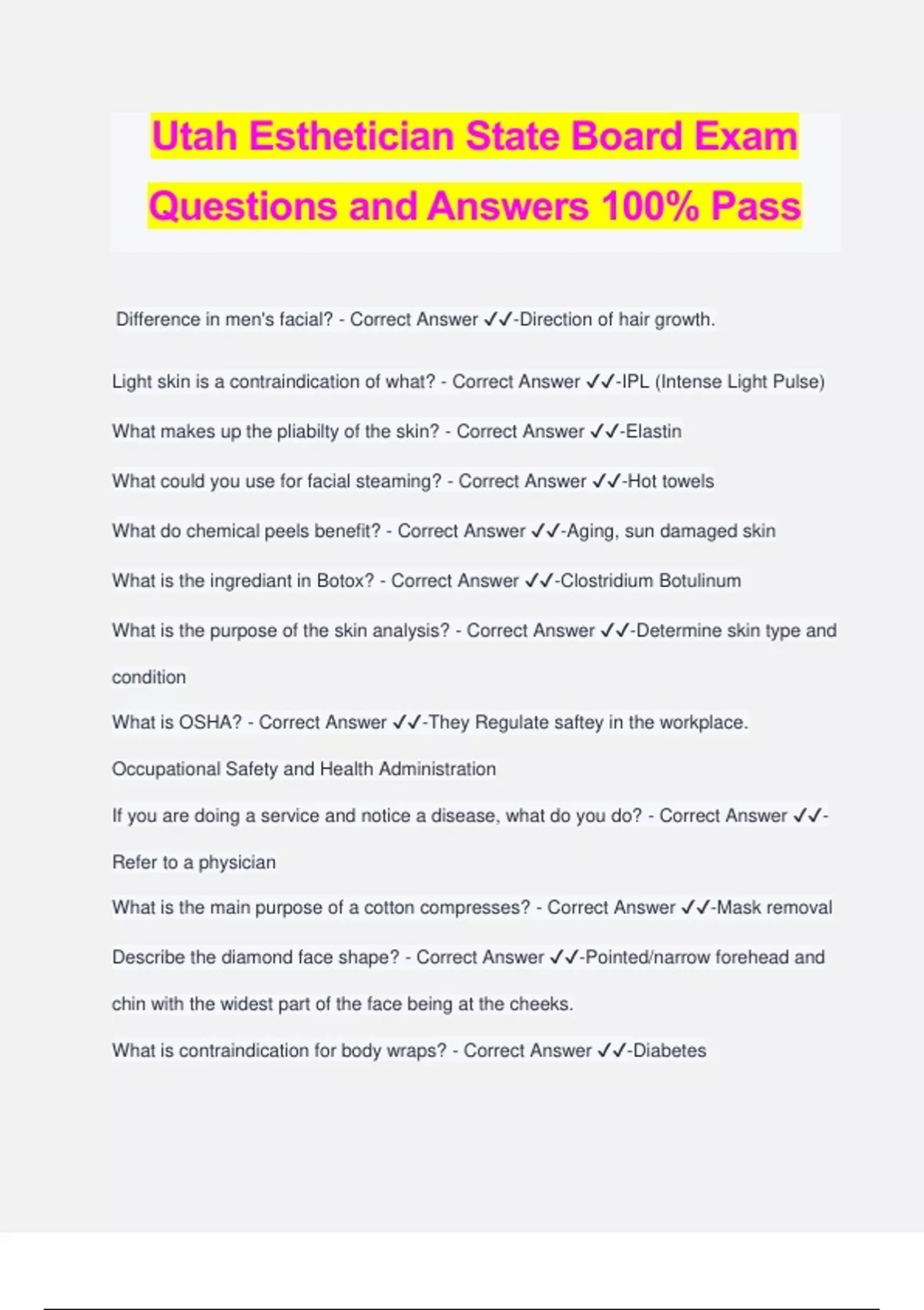 Utah Esthetician State Board Exam Questions and Answers 100% Pass