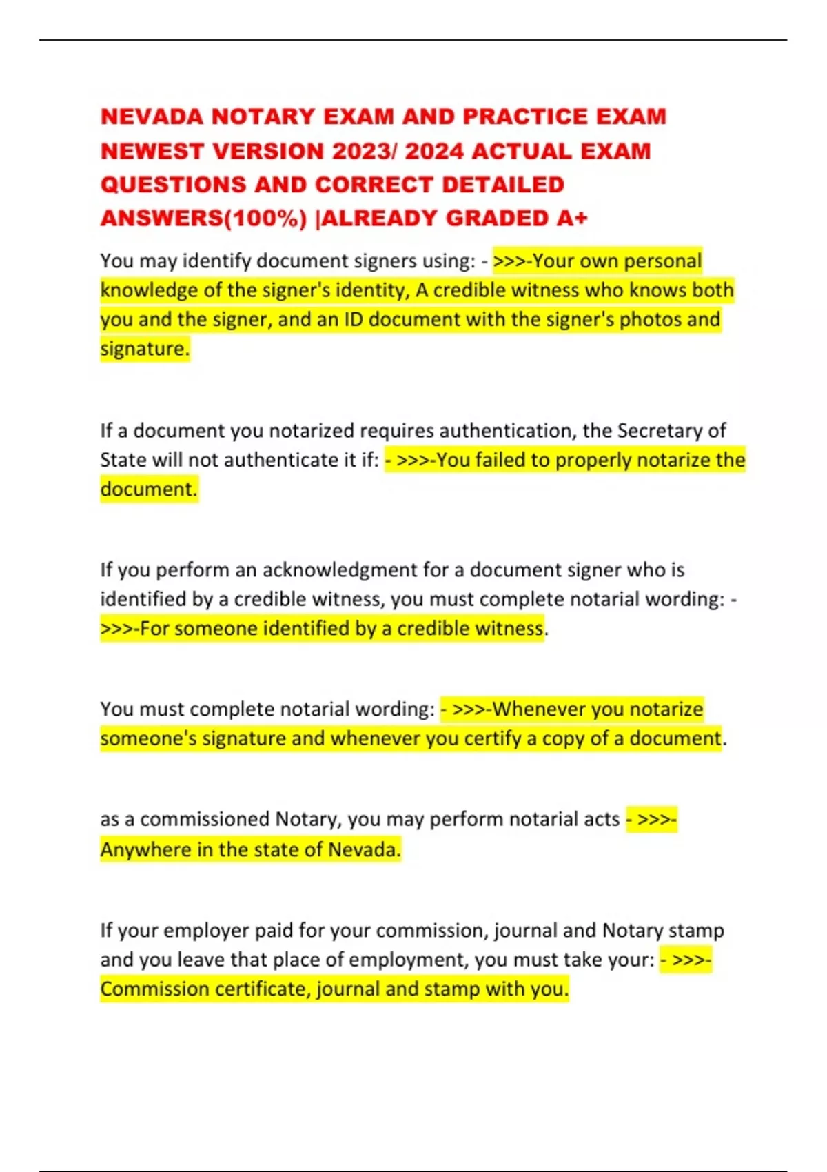 NEVADA NOTARY EXAM AND PRACTICE EXAM NEWEST VERSION 2023/ 2024 ACTUAL EXAM QUESTIONS AND CORRECT DETAILED ANSWERS(100%) |ALREADY GRADED A+