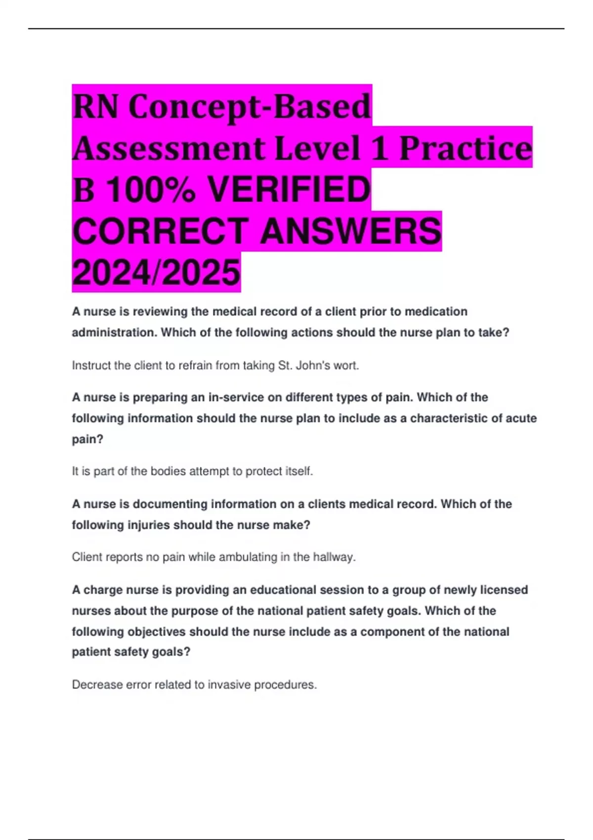 BEST REVIEW RN Concept-Based Assessment Level 1 Practice B 100% VERIFIED CORRECT ANSWERS 2024/2025