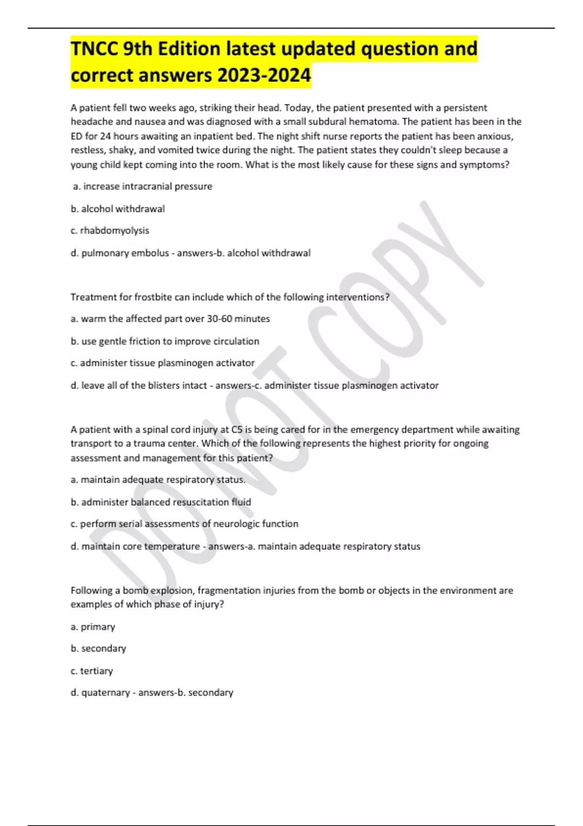 TNCC 9th Edition latest updated question and correct answers A patient fell two weeks ago, striking their head. Today, the patient presented with a persistent headache and nausea and was diagnosed with a small subdural hematoma. The patient has been in the ED for 24 hours awaiting an inpatient bed. The night shift nurse reports the patient has been anxious, restless, shaky, and vomited twice during the night. The patient states they couldn't sleep because a young child kept coming into the room. What is the most likely cause for these signs and symptoms? a. increase intracranial pressure b. alcohol withdrawal c. rhabdomyolysis d. pulmonary embolus - answers-b. alcohol withdrawal Treatment for frostbite can include which of the following interventions? a