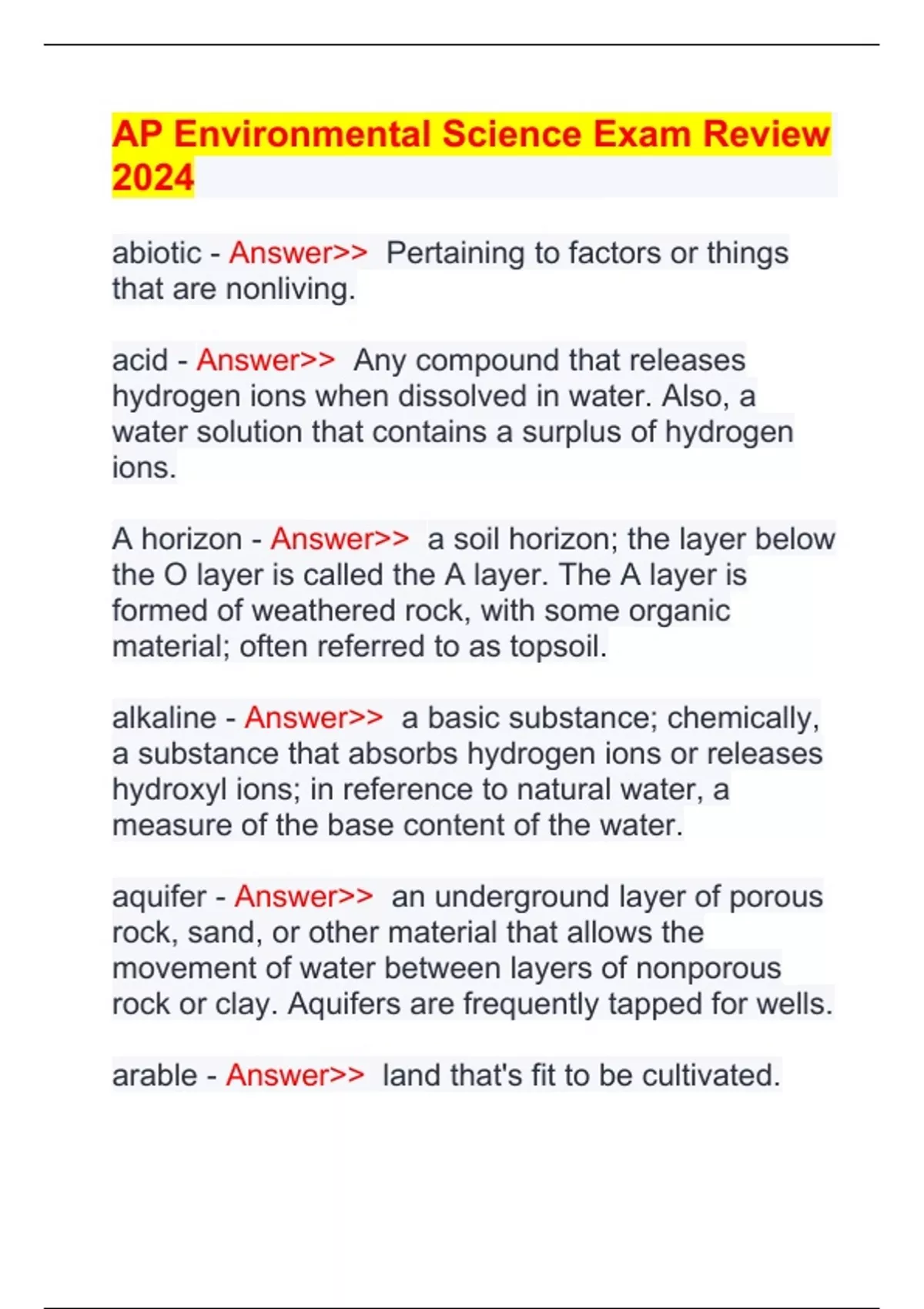 AP Environmental Science Exam Review 2024 abiotic - Answer>> Pertaining to factors or things that are nonliving. acid - Answer>> Any compound that releases hydrogen ions when dissolved in water. Also, a water solution that contains a surplus of hydrogen ions. A horizon - Answer>> a soil horizon; the layer below the O layer is called the A layer. The A layer is formed of weathered rock, with some organic material; often referred to as topsoil.