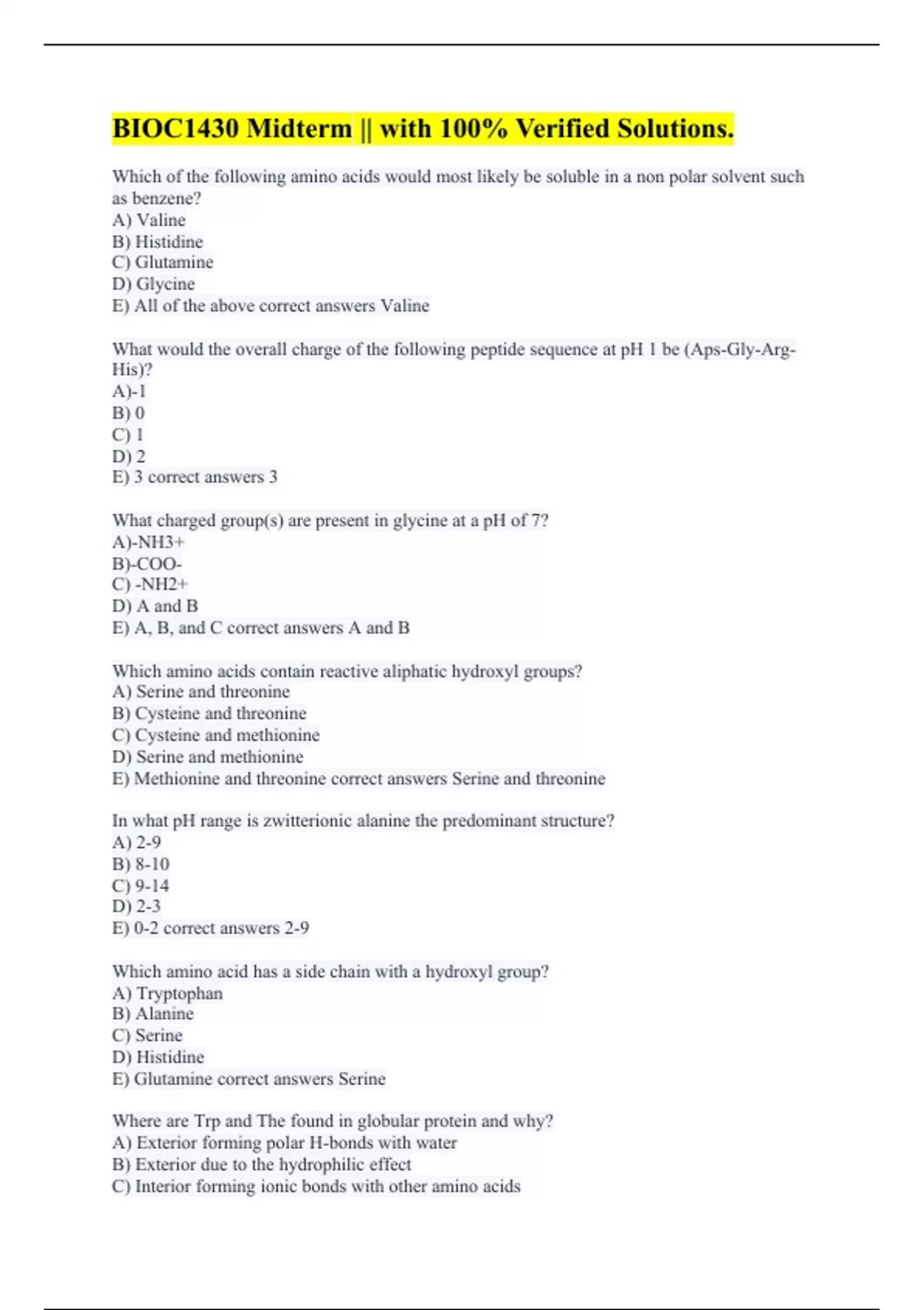 Which of the following amino acids would most likely be soluble in a non polar solvent such as benzene? A) Valine B) Histidine C) Glutamine D) Glycine E) All of the above correct answers Valine What would the overall charge of the following peptide sequence at pH 1 be (Aps-Gly-Arg-His)? A)-1 B) 0 C) 1 D) 2 E) 3 correct answers 3 What charged group(s) are present in glycine at a pH of 7? A)-NH3+ B)-COO- C) -NH2+ D) A and B E) A, B, and C correct answers A and B Which amino acids contain reactive aliphatic hydroxyl groups? A) Serine and threonine B) Cysteine and threonine C) Cysteine and methionine D) Serine and methionine E) Methionine and threonine correct answers Serine and threonine In what pH range is zwitterionic alanine the predominant structure? A) 2-9 B) 8-10 C) 9-14 D) 2-3 E) 0-2 correct answers 2-9 Which amino acid has a side chain with a hydroxyl group? A) Tryptophan B) Alanine C) Serine D) Histidine E) Glutamine correct answers Serine Where are Trp and The found in globular protein and why? A) Exterior forming polar H-bonds with water B) Exterior due to the hydrophilic effect C) Interior forming ionic bonds with other amino acids