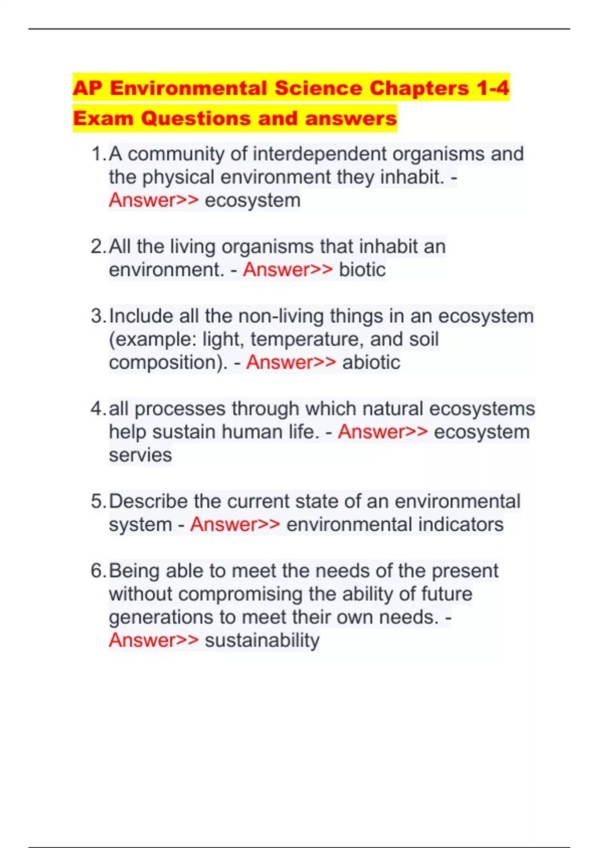 AP Environmental Science Chapters 1-4 Exam Questions and answers 1. A community of interdependent organisms and the physical environment they inhabit. - Answer>> ecosystem 2. All the living organisms that inhabit an environment. - Answer>> biotic 3. Include all the non-living things in an ecosystem (example: light, temperature, and soil composition). - Answer>> abiotic 4. all processes through which natural ecosystems help sustain human life. - Answer>> ecosystem servies 5. Describe the current state of an environmental system - Answer>> environmental indicators