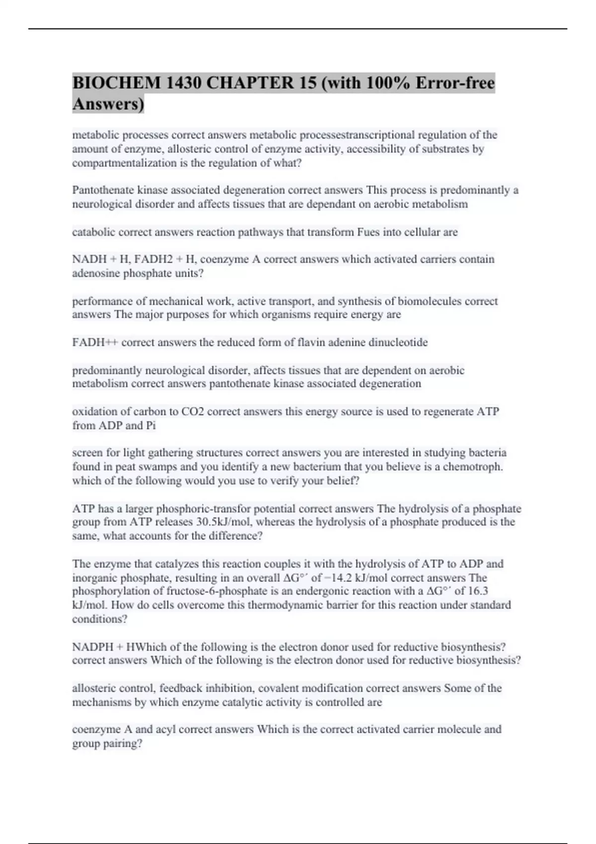 BIOCHEM 1430 CHAPTER 15 (with 100% Error-free Answers)