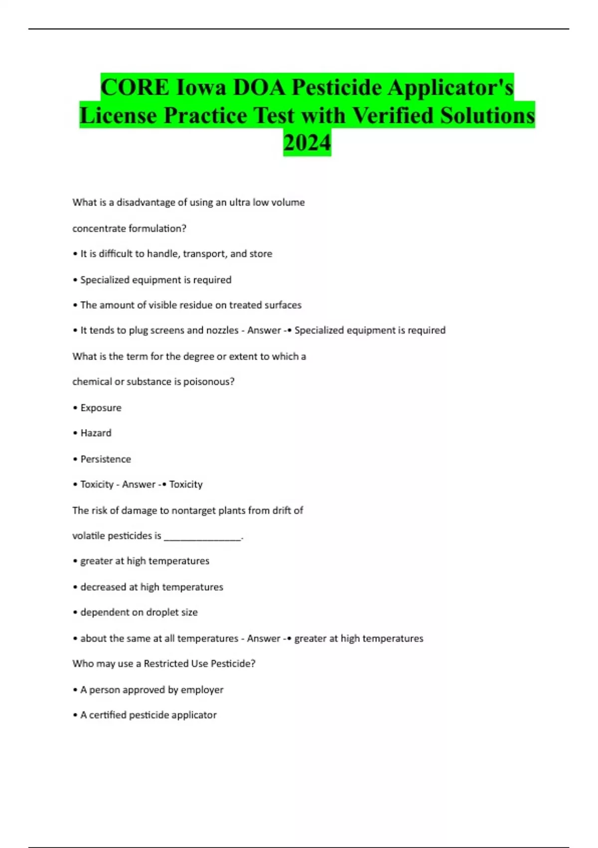 CORE Iowa DOA Pesticide Applicator's License Practice Test with Verified Solutions 2024 What is a disadvantage of using an ultra low volume concentrate formulation? • It is difficult to handle, transport, and store • Specialized equipment is required • The amount of visible residue on treated surfaces • It tends to plug screens and nozzles - Answer -• Specialized equipment is required What is the term for the degree or extent to which a chemical or substance is poisonous? • Exposure • Hazard • Persistence • Toxicity - Answer -• Toxicity The risk of damage to nontarget plants from drift of volatile pesticides is ______________. • greater at high temperatures • decreased at high temperatures • dependent on droplet size • about the same at all temperatures - Answer -• greater at high temperatures Who may use a Restricted Use Pesticide? • A person approved by employer • A certified pesticide applicator• An experienced pesticide applicator • Anyone with a legitimate need to use the product - Answer -• A certified pesticide applicator What is the term for unwanted contact with pesticides or pesticide residues? • Exposure • Hazard • Tolerance • Toxicity - Answer -• Exposure A pesticide label calls for a broadcast application using 2 pints of product per acre. Your sprayer holds 375 gallons and is calibrated to apply 15 gallons of spray mixture per acre. How much product is needed for each fill? • 25 pints • 30 pints