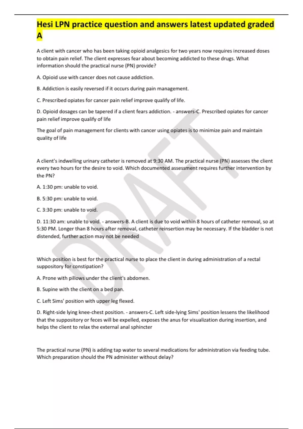 Hesi LPN practice question and answers latest updated graded A A client with cancer who has been taking opioid analgesics for two years now requires increased doses to obtain pain relief. The client expresses fear about becoming addicted to these drugs. What information should the practical nurse (PN) provide? A. Opioid use with cancer does not cause addiction. B. Addiction is easily reversed if it occurs during pain management. C. Prescribed opiates for cancer pain relief improve qualify of life. D. Opioid dosages can be tapered if a client fears addiction. - answers-C. Prescribed opiates for cancer pain relief improve qualify of life