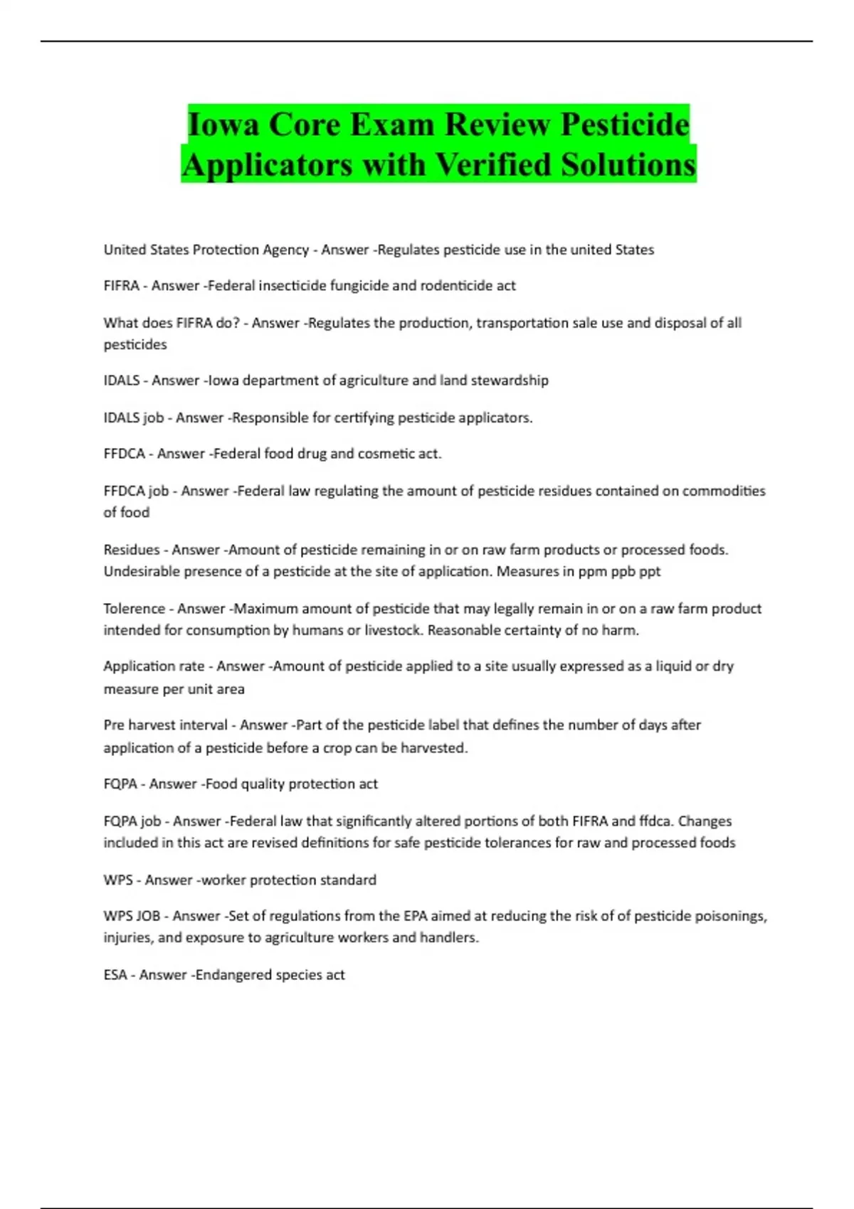 Iowa Core Exam Review Pesticide Applicators with Verified Solutions United States Protection Agency - Answer -Regulates pesticide use in the united States FIFRA - Answer -Federal insecticide fungicide and rodenticide act What does FIFRA do? - Answer -Regulates the production, transportation sale use and disposal of all pesticides IDALS - Answer -Iowa department of agriculture and land stewardship IDALS job - Answer -Responsible for certifying pesticide applicators. FFDCA - Answer -Federal food drug and cosmetic act. FFDCA job - Answer -Federal law regulating the amount of pesticide residues contained on commodities of food Residues - Answer -Amount of pesticide remaining in or on raw farm products or processed foods. Undesirable presence of a pesticide at the site of application. Measures in ppm ppb ppt Tolerence - Answer -Maximum amount of pesticide that may legally remain in or on a raw farm product intended for consumption by humans or livestock. Reasonable certainty of no harm. Application rate - Answer -Amount of pesticide applied to a site usually expressed as a liquid or dry measure per unit area Pre harvest interval - Answer -Part of the pesticide label that defines the number of days after application of a pesticide before a crop can be harvested. FQPA - Answer -Food quality protection act FQPA job - Answer -Federal law that significantly altered portions of both FIFRA and ffdca. Changes included in this act are revised definitions for safe pesticide tolerances for raw and processed foods WPS - Answer -worker protection standard WPS JOB - Answer -Set of regulations from the EPA aimed at reducing the risk of of pesticide poisonings, injuries, and exposure to agriculture workers and handlers. ESA - Answer -Endangered species act