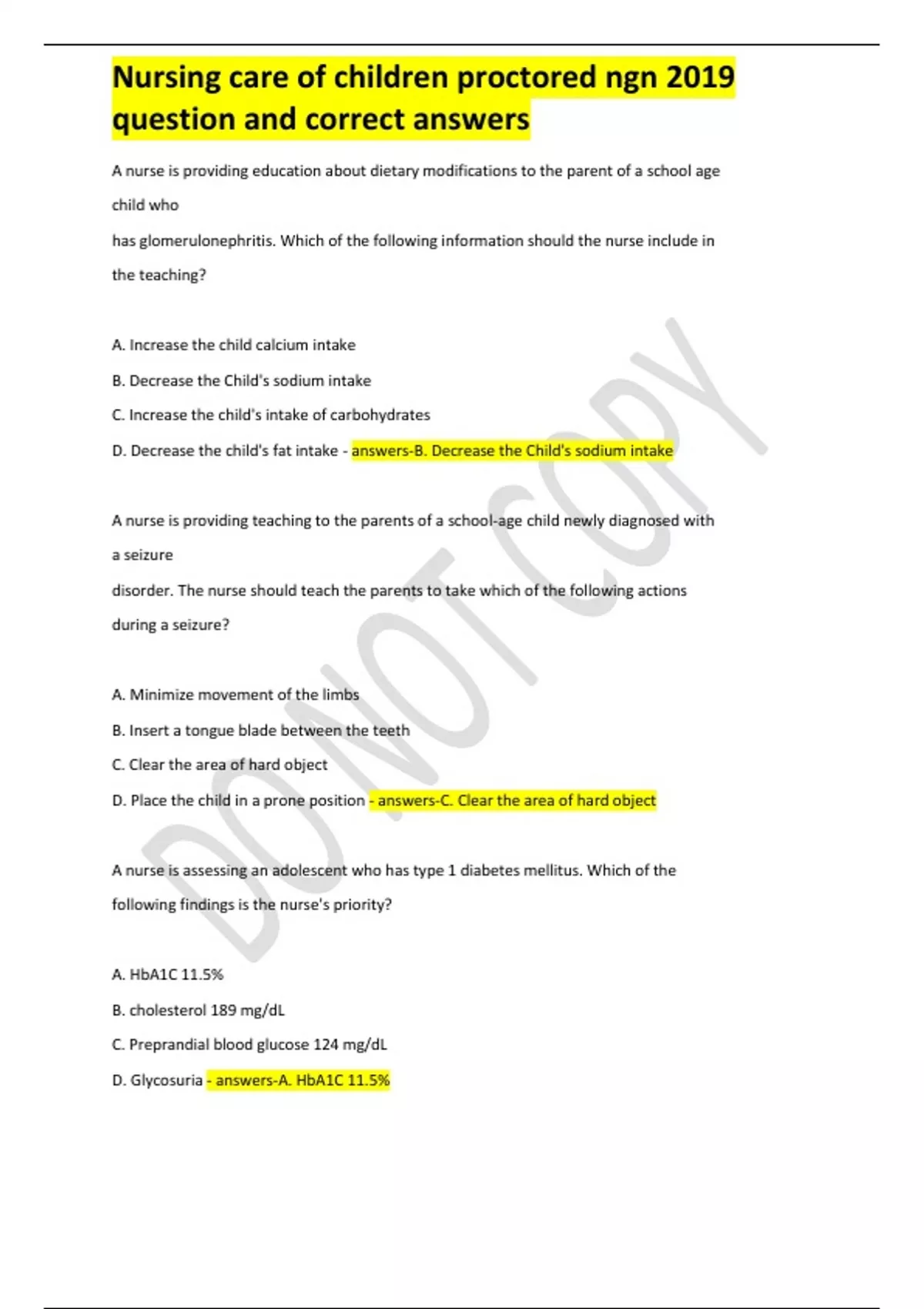Nursing care of children proctored ngn 2019 question and correct answers A nurse is providing education about dietary modifications to the parent of a school age child who has glomerulonephritis. Which of the following information should the nurse include in the teaching? A. Increase the child calcium intake B. Decrease the Child's sodium intake C. Increase the child's intake of carbohydrates D. Decrease the child's fat intake - answers-B. Decrease the Child's sodium intake