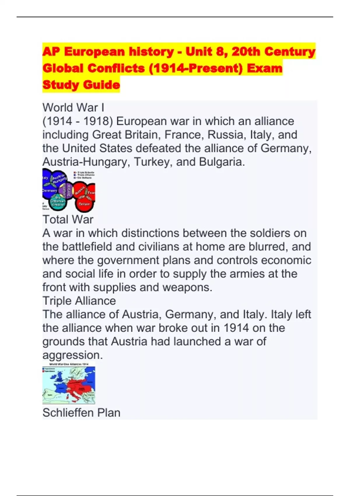 AP European history - Unit 8, 20th Century Global Conflicts (1914-Present) Exam Study Guide World War I () European war in which an alliance including Great Britain, France, Russia, Italy, and the United States defeated the alliance of Germany, Austria-Hungary, Turkey, and Bulgaria. Total War A war in which distinctions between the soldiers on the battlefield and civilians at home are blurred, and where the government plans and controls economic and social life in order to supply the armies at the front with supplies and weapons. Triple Alliance The alliance of Austria, Germany, and Italy. Italy left the alliance when war broke out in 1914 on the grounds that Austria had launched a war of aggression.