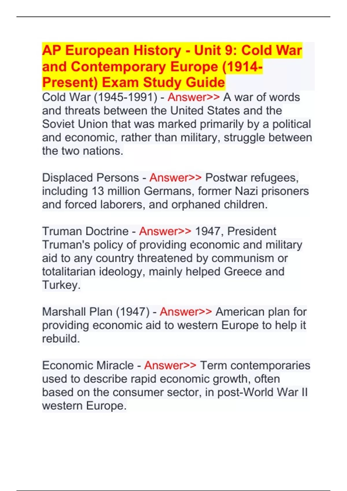 AP European History - Unit 9: Cold War and Contemporary Europe (1914-Present) Exam Study Guide Cold War () - Answer>> A war of words and threats between the United States and the Soviet Union that was marked primarily by a political and economic, rather than military, struggle between the two nations. Displaced Persons - Answer>> Postwar refugees, including 13 million Germans, former Nazi prisoners and forced laborers, and orphaned children. Truman Doctrine - Answer>> 1947, President Truman's policy of providing economic and military aid to any country threatened by communism or totalitarian ideology, mainly helped Greece and Turkey.