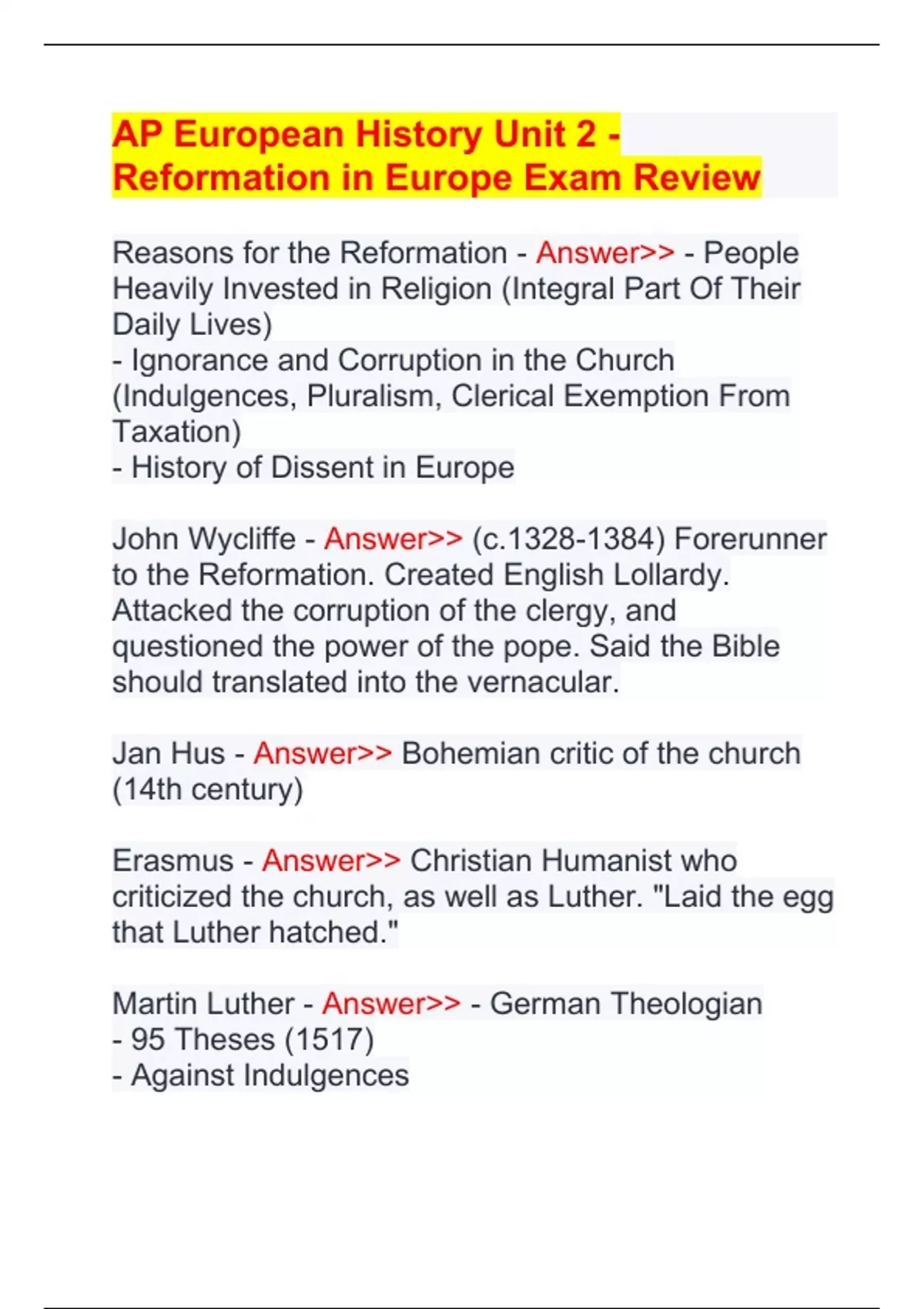 AP European History Unit 2 - Reformation in Europe Exam Review Reasons for the Reformation - Answer>> - People Heavily Invested in Religion (Integral Part Of Their Daily Lives) - Ignorance and Corruption in the Church (Indulgences, Pluralism, Clerical Exemption From Taxation) - History of Dissent in Europe John Wycliffe - Answer>> (c.) Forerunner to the Reformation. Created English Lollardy. Attacked the corruption of the clergy, and questioned the power of the pope. Said the Bible should translated into the vernacular.