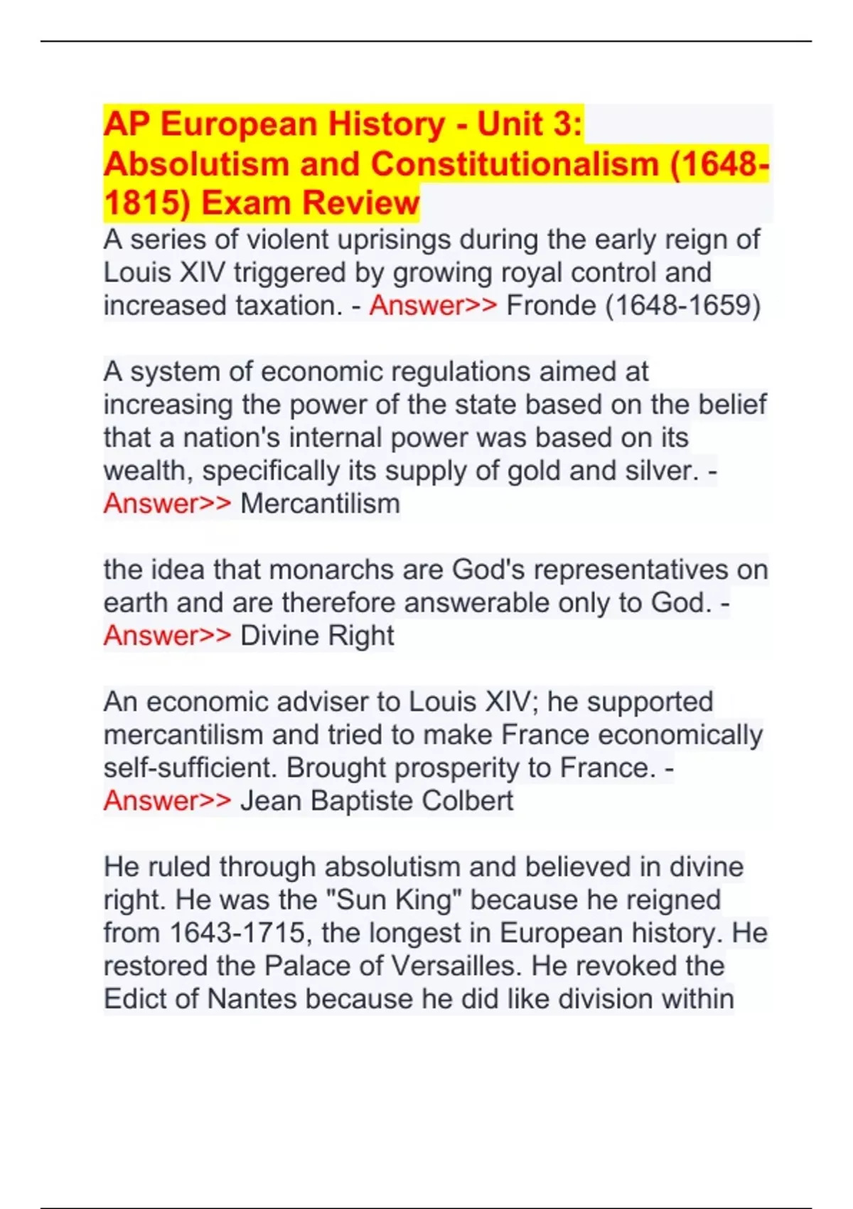 AP European History - Unit 3: Absolutism and Constitutionalism () Exam Review A series of violent uprisings during the early reign of Louis XIV triggered by growing royal control and increased taxation. - Answer>> Fronde () A system of economic regulations aimed at increasing the power of the state based on the belief that a nation's internal power was based on its wealth, specifically its supply of gold and silver. - Answer>> Mercantilism