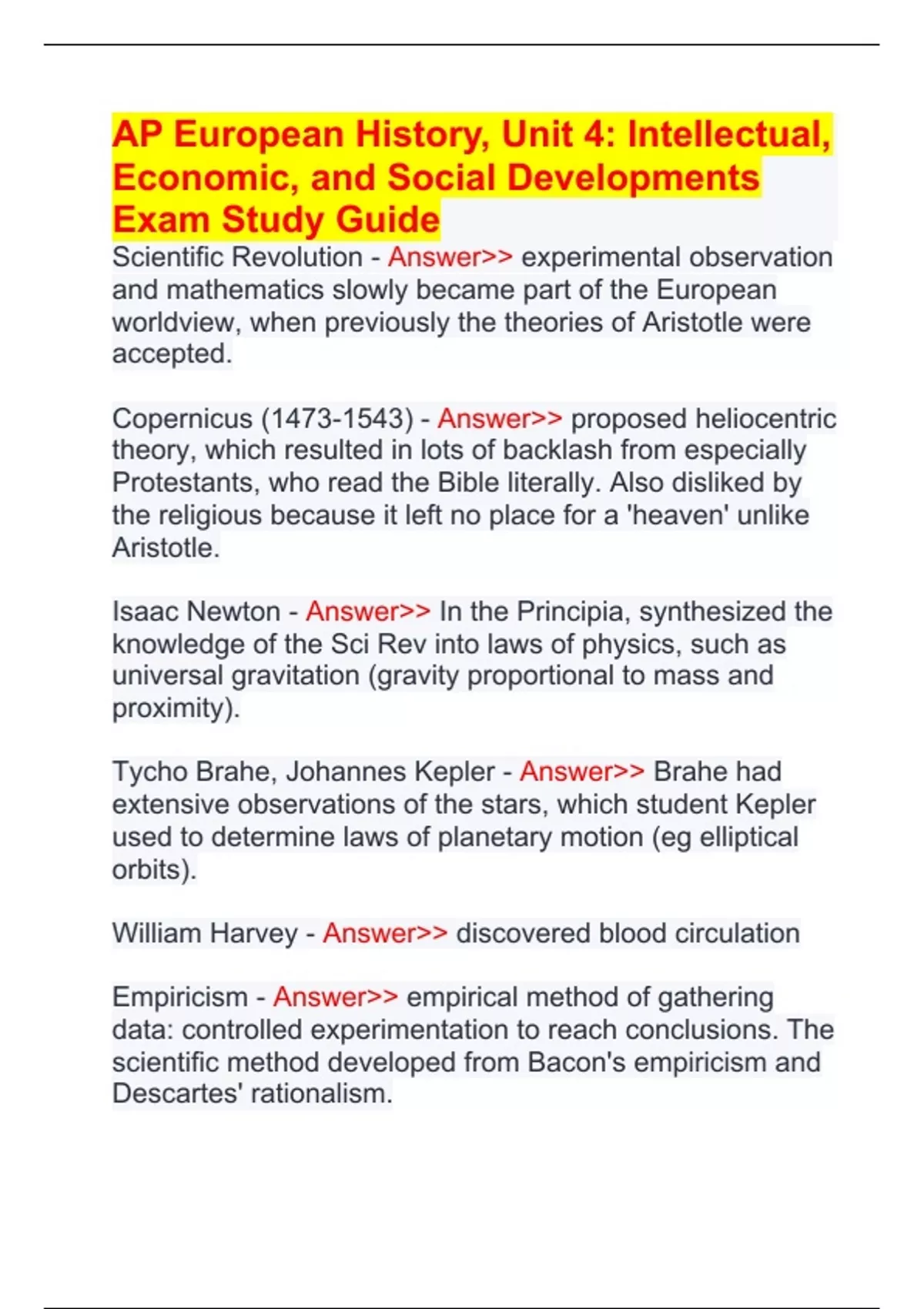 AP European History, Unit 4: Intellectual, Economic, and Social Developments Exam Study Guide Scientific Revolution - Answer>> experimental observation and mathematics slowly became part of the European worldview, when previously the theories of Aristotle were accepted. Copernicus () - Answer>> proposed heliocentric theory, which resulted in lots of backlash from especially Protestants, who read the Bible literally. Also disliked by the religious because it left no place for a 'heaven' unlike Aristotle. Isaac Newton - Answer>> In the Principia, synthesized the knowledge of the Sci Rev into laws of physics, such as universal gravitation (gravity proportional to mass and proximity).