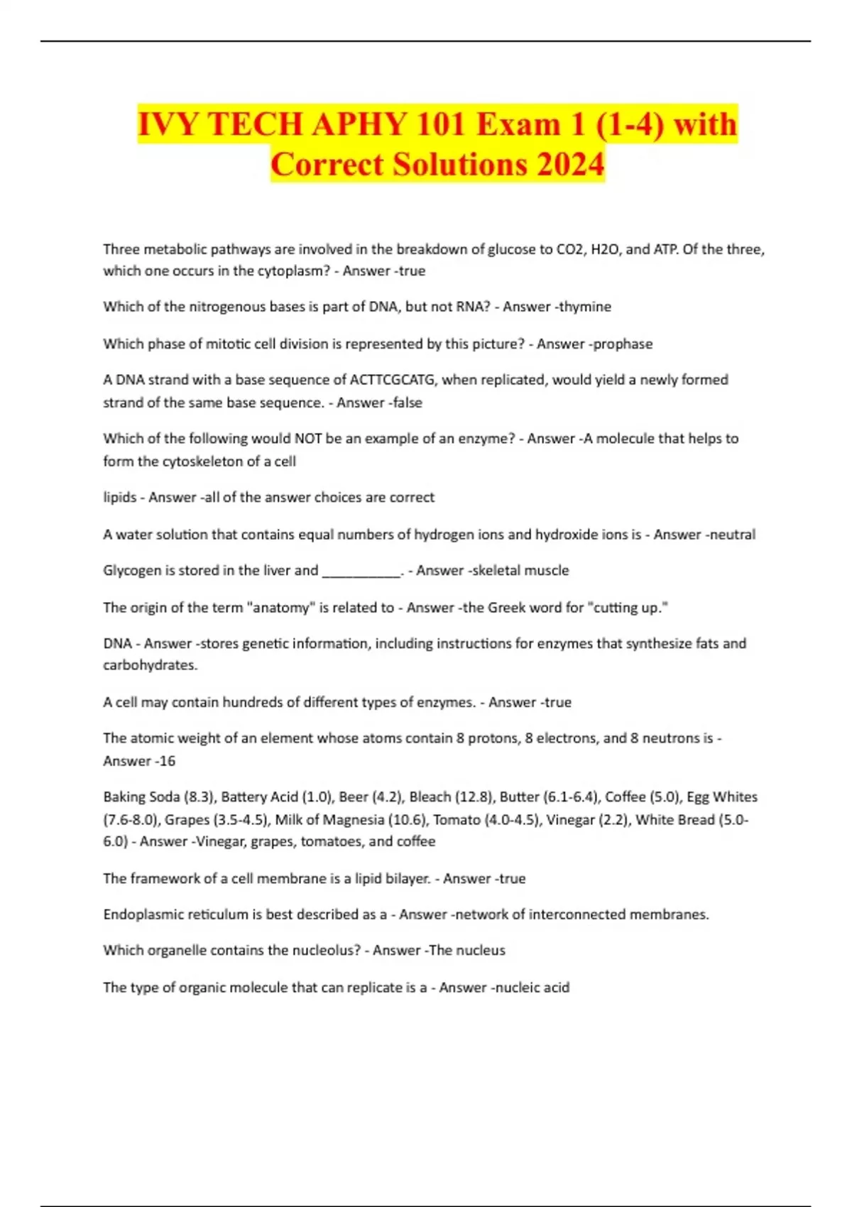IVY TECH APHY 101 Exam 1 (1-4) with Correct Solutions 2024 Three metabolic pathways are involved in the breakdown of glucose to CO2, H2O, and ATP. Of the three, which one occurs in the cytoplasm? - Answer -true Which of the nitrogenous bases is part of DNA, but not RNA? - Answer -thymine Which phase of mitotic cell division is represented by this picture? - Answer -prophase A DNA strand with a base sequence of ACTTCGCATG, when replicated, would yield a newly formed strand of the same base sequence. - Answer -false Which of the following would NOT be an example of an enzyme? - Answer -A molecule that helps to form the cytoskeleton of a cell lipids - Answer -all of the answer choices are correct A water solution that contains equal numbers of hydrogen ions and hydroxide ions is - Answer -neutral Glycogen is stored in the liver and __________. - Answer -skeletal muscle The origin of the term "anatomy" is related to - Answer -the Greek word for "cutting up." DNA - Answer -stores genetic information, including instructions for enzymes that synthesize fats and carbohydrates. A cell may contain hundreds of different types of enzymes. - Answer -true The atomic weight of an element whose atoms contain 8 protons, 8 electrons, and 8 neutrons is - Answer -16 Baking Soda (8.3), Battery Acid (1.0), Beer (4.2), Bleach (12.8), Butter (6.1-6.4), Coffee (5.0), Egg Whites (7.6-8.0), Grapes (3.5-4.5), Milk of Magnesia (10.6), Tomato (4.0-4.5), Vinegar (2.2), White Bread (5.0- 6.0) - Answer -Vinegar, grapes, tomatoes, and coffee The framework of a cell membrane is a lipid bilayer. - Answer -true Endoplasmic reticulum is best described as a - Answer -network of interconnected membranes. Which organelle contains the nucleolus? - Answer -The nucleus The type of organic molecule that can replicate is a - Answer -nucleic acid