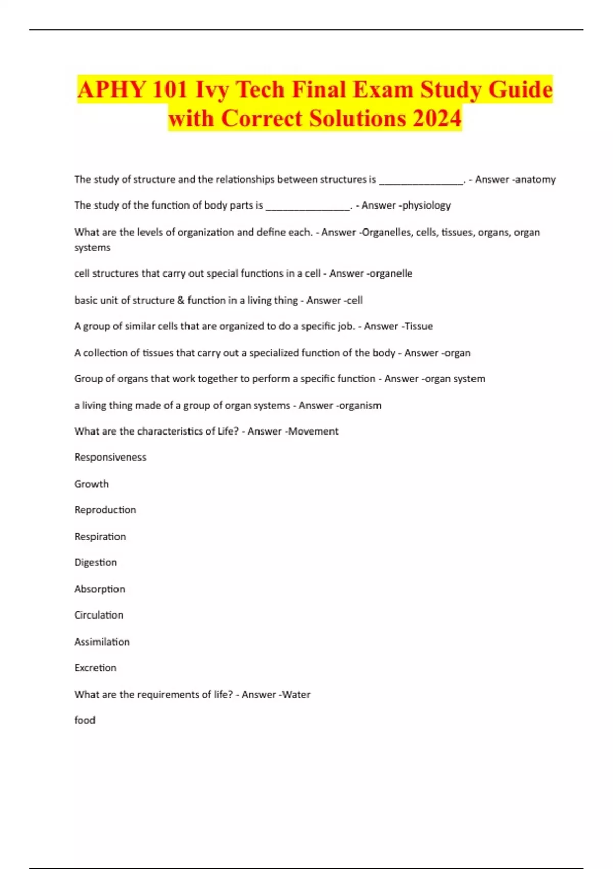 APHY 101 Ivy Tech Final Exam Study Guide with Correct Solutions 2024