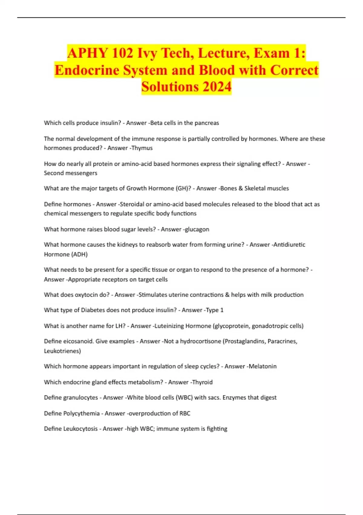 APHY 102 Ivy Tech, Lecture, Exam 1: Endocrine System and Blood with Correct Solutions 2024