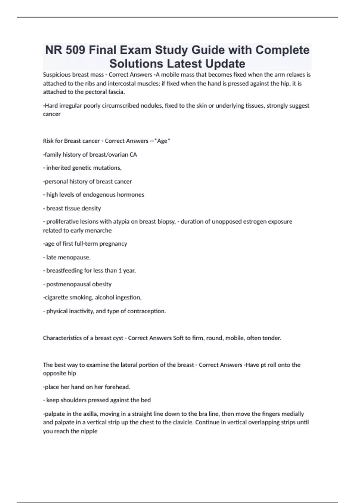 NR 509 Final Exam Study Guide with Complete Solutions Latest Update Suspicious breast mass - Correct Answers -A mobile mass that becomes fixed when the arm relaxes is attached to the ribs and intercostal muscles; if fixed when the hand is pressed against the hip, it is attached to the pectoral fascia. -Hard irregular poorly circumscribed nodules, fixed to the skin or underlying tissues, strongly suggest cancer Risk for Breast cancer - Correct Answers --*Age* -family history of breast/ovarian CA - inherited genetic mutations, -personal history of breast cancer - high levels of endogenous hormones - breast tissue density - proliferative lesions with atypia on breast biopsy, - duration of unopposed estrogen exposure related to early menarche -age of first full-term pregnancy - late menopause. - breastfeeding for less than 1 year, - postmenopausal obesity -cigarette smoking, alcohol ingestion, - physical inactivity, and type of contraception. Characteristics of a breast cyst - Correct Answers Soft to firm, round, mobile, often tender. The best way to examine the lateral portion of the breast - Correct Answers -Have pt roll onto the opposite hip -place her hand on her forehead. - keep shoulders pressed against the bed -palpate in the axilla, moving in a straight line down to the bra line, then move the fingers medially and palpate in a vertical strip up the chest to the clavicle. Continue in vertical overlapping strips until you reach the nipple Bacterial Vaginosis (BV) - Correct Answers -