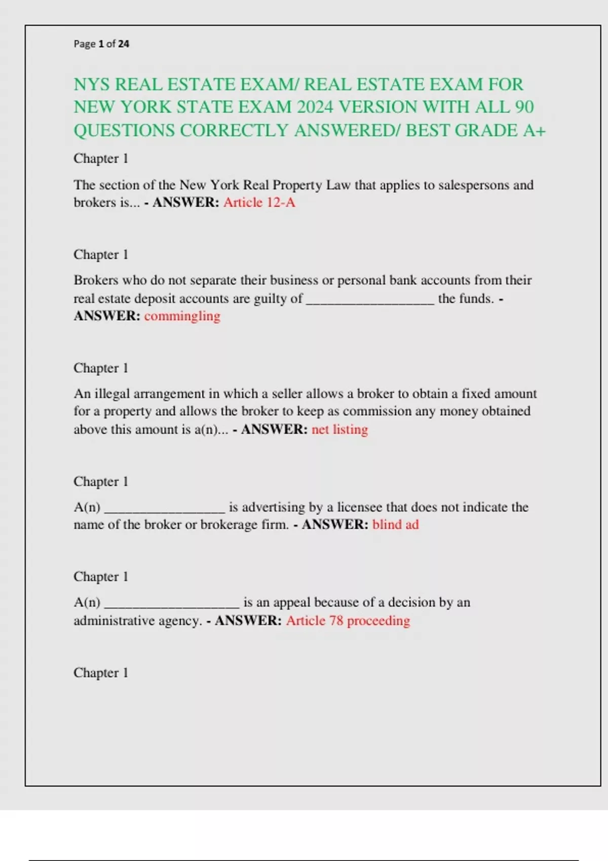 NYS REAL ESTATE EXAM/ REAL ESTATE EXAM FOR NEW YORK STATE EXAM 2024 VERSION WITH ALL 90 QUESTIONS CORRECTLY ANSWERED/ BEST GRADE A+