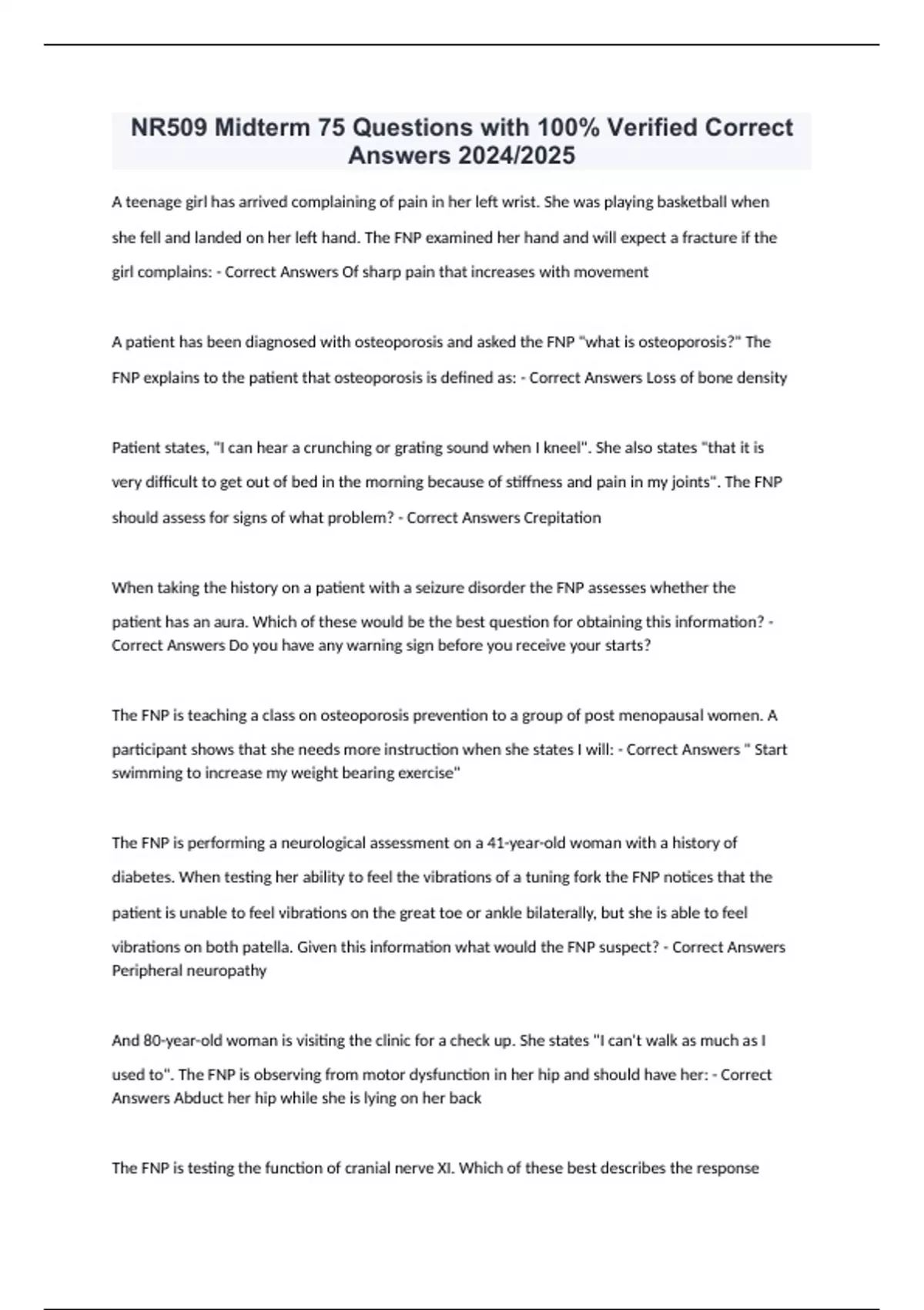 NR509 Midterm 75 Questions with 100% Verified Correct Answers 2024/2025 A teenage girl has arrived complaining of pain in her left wrist. She was playing basketball when she fell and landed on her left hand. The FNP examined her hand and will expect a fracture if the girl complains: - Correct Answers Of sharp pain that increases with movement A patient has been diagnosed with osteoporosis and asked the FNP "what is osteoporosis?" The FNP explains to the patient that osteoporosis is defined as: - Correct Answers Loss of bone density Patient states, "I can hear a crunching or grating sound when I kneel". She also states "that it is very difficult to get out of bed in the morning because of stiffness and pain in my joints". The FNP should assess for signs of what problem? - Correct Answers Crepitation When taking the history on a patient with a seizure disorder the FNP assesses whether the patient has an aura. Which of these would be the best question for obtaining this information? - Correct Answers Do you have any warning sign before you receive your starts? The FNP is teaching a class on osteoporosis prevention to a group of post menopausal women. A participant shows that she needs more instruction when she states I will: - Correct Answers " Start swimming to increase my weight bearing exercise" The FNP is performing a neurological assessment on a 41-year-old woman with a history of diabetes. When testing her ability to feel the vibrations of a tuning fork the FNP notices that the patient is unable to feel vibrations on the great toe or ankle bilaterally, but she is able to feel vibrations on both patella. Given this information what would the FNP suspect? - Correct Answers Peripheral neuropathy And 80-year-old woman is visiting the clinic for a check up. She states "I can't walk as much as I used to". The FNP is observing from motor dysfunction in her hip and should have her: - Correct Answers Abduct her hip while she is lying on her back The FNP is testing the function of cranial nerve XI. Which of these best describes the response the FNP should ex