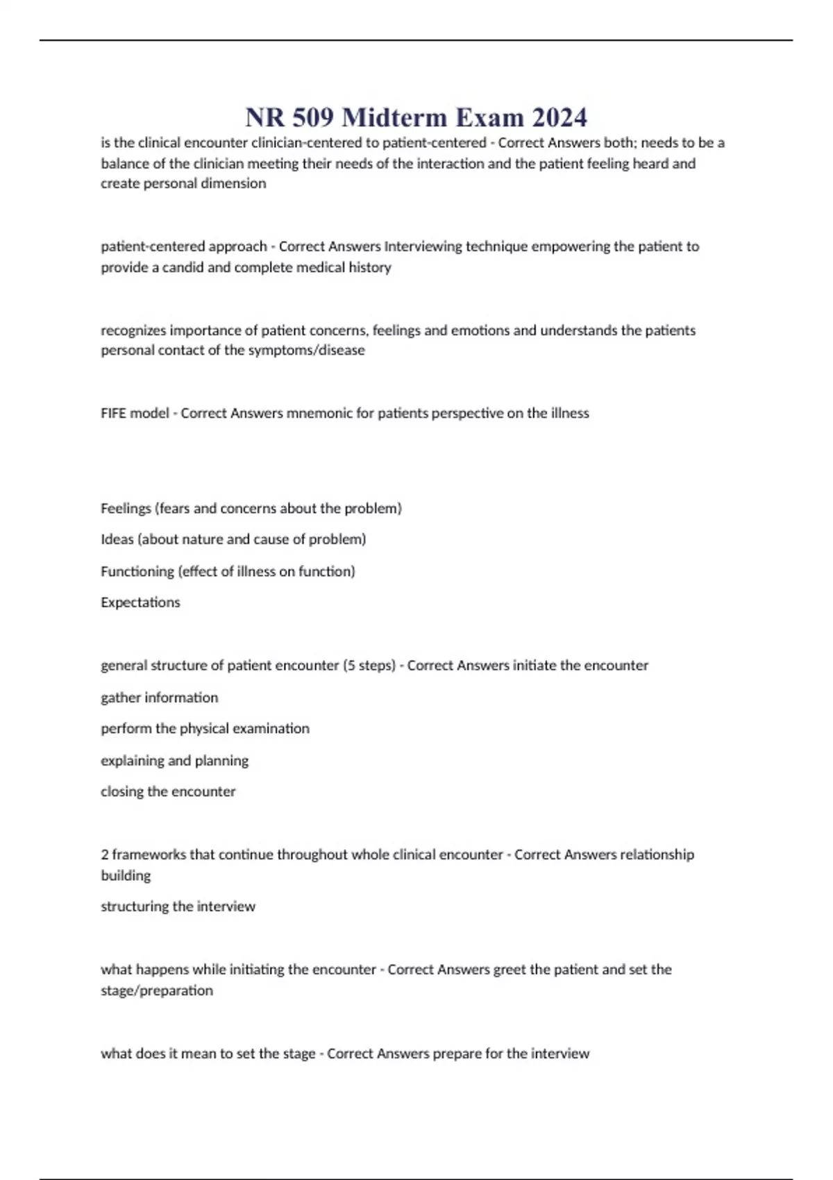 NR 509 Midterm Exam 2024 is the clinical encounter clinician-centered to patient-centered - Correct Answers both; needs to be a balance of the clinician meeting their needs of the interaction and the patient feeling heard and create personal dimension patient-centered approach - Correct Answers Interviewing technique empowering the patient to provide a candid and complete medical history recognizes importance of patient concerns, feelings and emotions and understands the patients personal contact of the symptoms/disease FIFE model - Correct Answers mnemonic for patients perspective on the illness Feelings (fears and concerns about the problem) Ideas (about nature and cause of problem) Functioning (effect of illness on function) Expectations general structure of patient encounter (5 steps) - Correct Answers initiate the encounter gather information perform the physical examination explaining and planning closing the encounter 2 frameworks that continue throughout whole clinical encounter - Correct Answers relationship building structuring the interview what happens while initiating the encounter - Correct Answers greet the patient and set the stage/preparation what does it mean to set the stage - Correct Answ