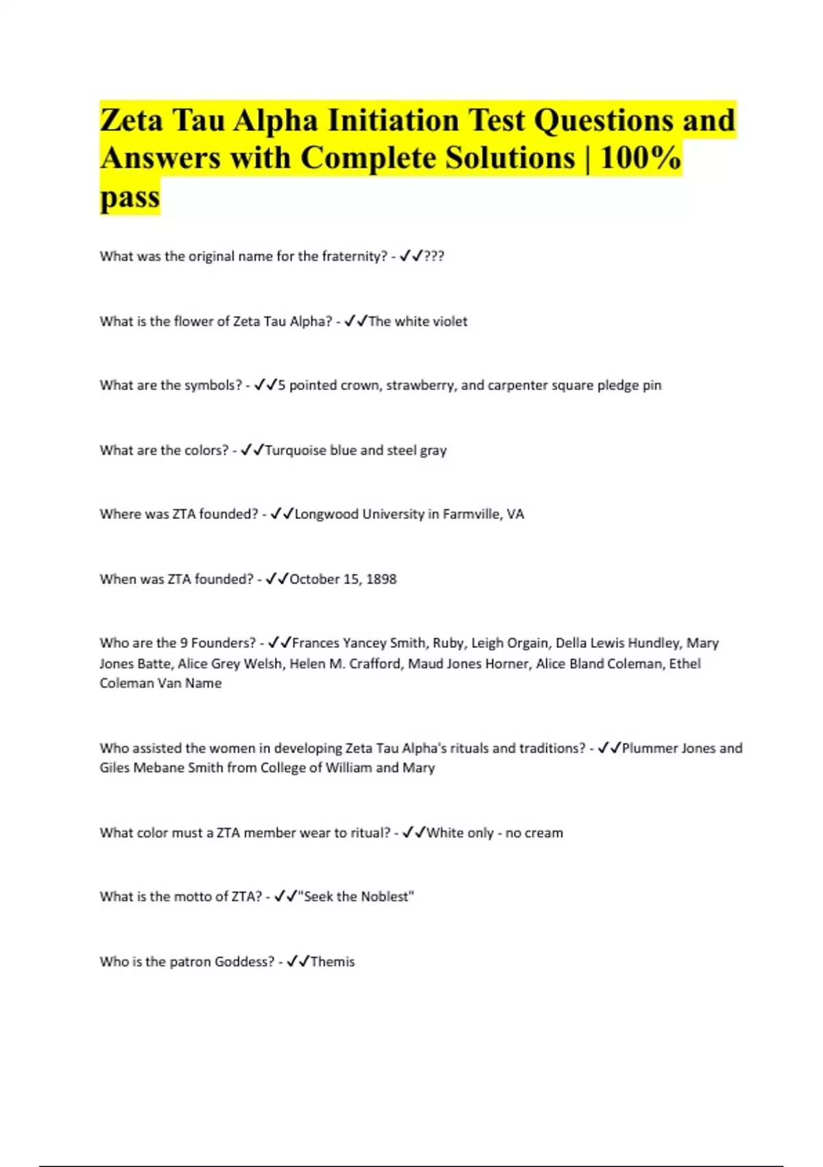 Zeta Tau Alpha Initiation Test Questions and Answers with Complete Solutions | 100% pass