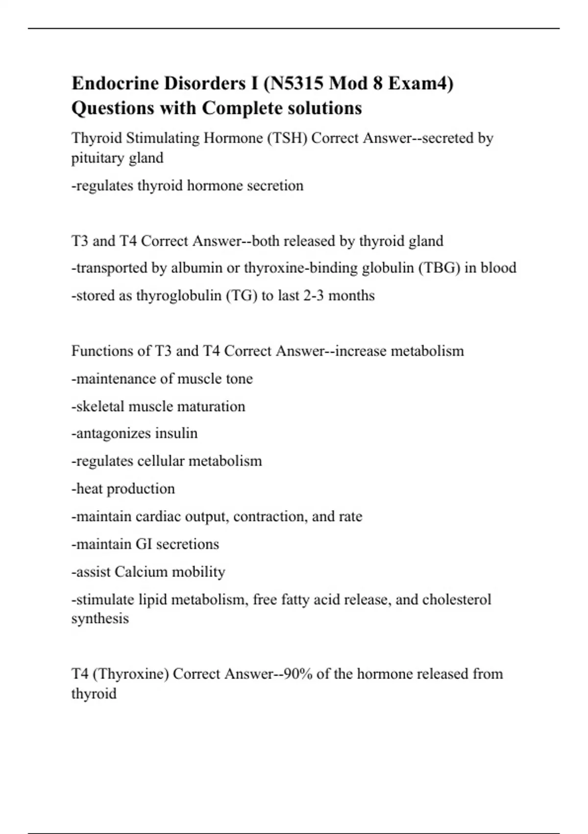 Thyroid Stimulating Hormone (TSH) Correct Answer--secreted by pituitary gland -regulates thyroid hormone secretion T3 and T4 Correct Answer--both released by thyroid gland -transported by albumin or thyroxine-binding globulin (TBG) in blood -stored as thyroglobulin (TG) to last 2-3 months Functions of T3 and T4 Correct Answer--increase metabolism -maintenance of muscle tone -skeletal muscle maturation -antagonizes insulin -regulates cellular metabolism -heat production -maintain cardiac output, contraction, and rate -maintain GI secretions -assist Calcium mobility -stimulate lipid metabolism, free fatty acid release, and cholesterol synthesis T4 (Thyroxine) Correct Answer--90% of the hormone released from thyroid -less potent