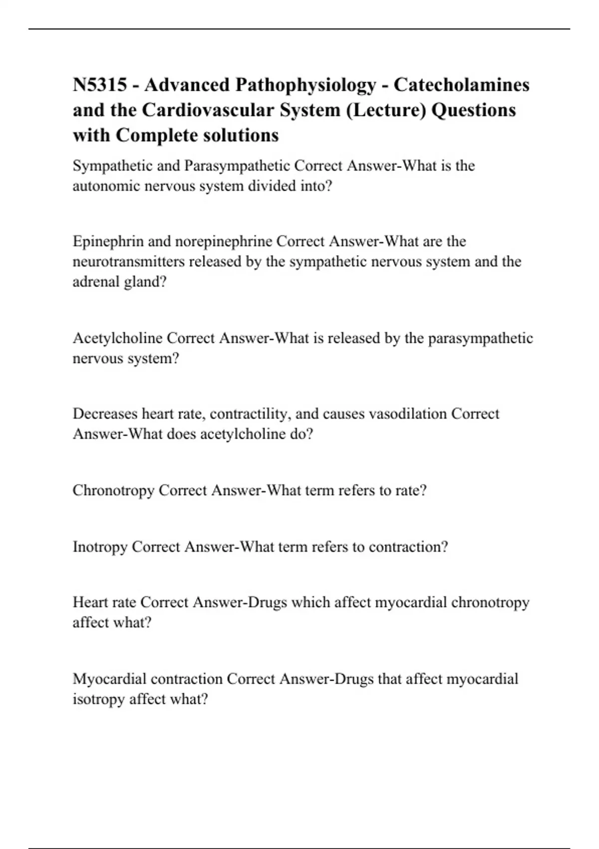 N5315 - Advanced Pathophysiology - Catecholamines and the Cardiovascular System (Lecture) Questions with Complete solutions