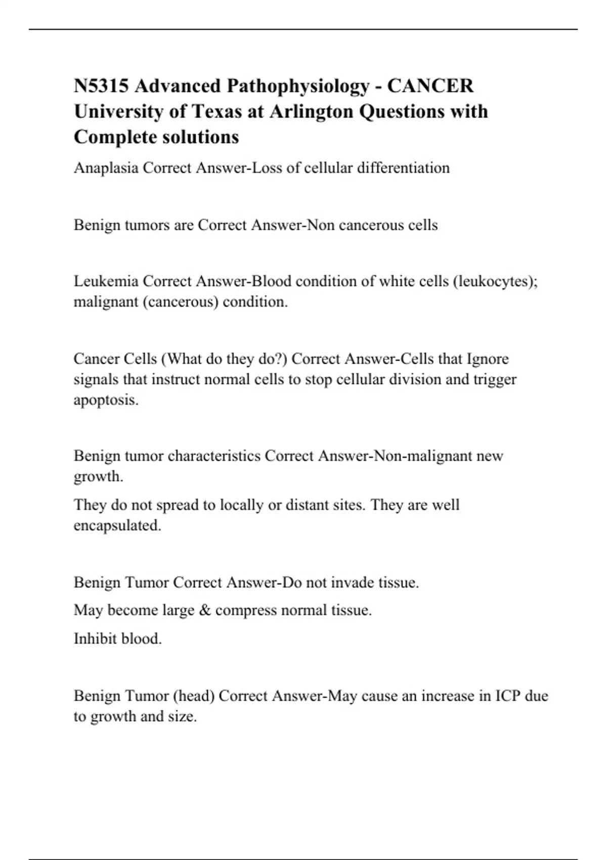 Anaplasia Correct Answer-Loss of cellular differentiation Benign tumors are Correct Answer-Non cancerous cells Leukemia Correct Answer-Blood condition of white cells (leukocytes); malignant (cancerous) condition. Cancer Cells (What do they do?) Correct Answer-Cells that Ignore signals that instruct normal cells to stop cellular division and trigger apoptosis. Benign tumor characteristics Correct Answer-Non-malignant new growth. They do not spread to locally or distant sites. They are well encapsulated. Benign Tumor Correct Answer-Do not invade tissue. May become large & compress normal tissue. Inhibit blood. Benign Tumor (head) Correct Answer-May cause an increase in ICP due to growth and size.