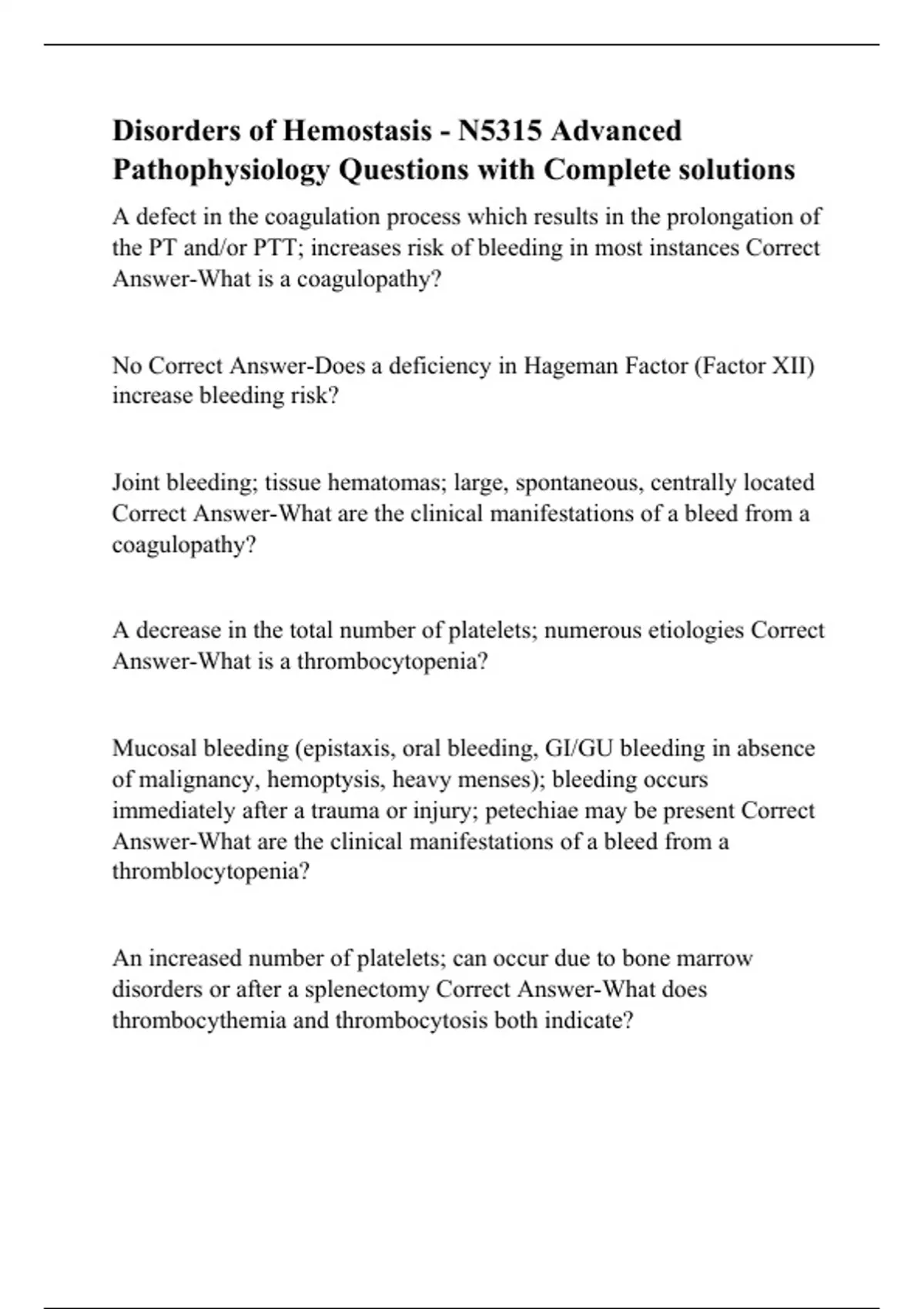 Disorders of Hemostasis - N5315 Advanced Pathophysiology Questions with Complete solutions