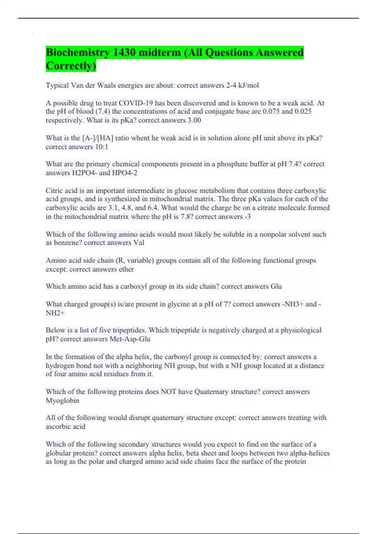 Typical Van der Waals energies are about: correct answers 2-4 kJ/mol A possible drug to treat COVID-19 has been discovered and is known to be a weak acid. At the pH of blood (7.4) the concentrations of acid and conjugate base are 0.075 and 0.025 respectively. What is its pKa? correct answers 3.00 What is the [A-]/[HA] ratio whent he weak acid is in solution alone pH unit above its pKa? correct answers 10:1 What are the primary chemical components present in a phosphate buffer at pH 7.4? correct answers H2PO4- and HPO4-2 Citric acid is an important intermediate in glucose metabolism that contains three carboxylic acid groups, and is synthesized in mitochondrial matrix. The three pKa values for each of the carboxylic acids are 3.1, 4.8, and 6.4. What would the charge be on a citrate molecule formed in the mitochondrial matrix where the pH is 7.8? correct answers -3 Which of the following amino acids would most likely be soluble in a nonpolar solvent such as benzene? correct answers Val Amino acid side chain (R, variable) groups contain all of the following functional groups except: correct answers ether Which amino acid has a carboxyl group in its side chain? correct answers Glu What charged group(s) is/are present in glycine at a pH of 7? correct answers -NH3+ and -NH2+ Below is a list of five tripeptides. Which tripeptide is negatively charged at a physiological pH? correct answers Met-Asp-Glu In the formation of the alpha helix, the carbonyl group is connected by: correct answers a hydrogen bond not with a neighboring NH group, but with a NH group located at a distance of four amino acid residues from it. Which of the following proteins does NOT have Quaternary structure? correct answers Myoglobin All of the following would disrupt quaternary structure except: correct answers treating with ascorbic acid Which of the following secondary structures would you expect to find on the surface of a globular protein? correct answers alpha helix, beta sheet and loops between two alpha-helices as long as the polar and charged amino acid side chains face the surface of the protein