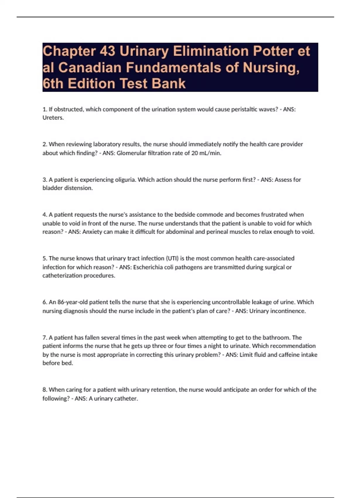 Chapter 43 Urinary Elimination Potter et al Canadian Fundamentals of Nursing, 6th Edition Test Bank Graded A+