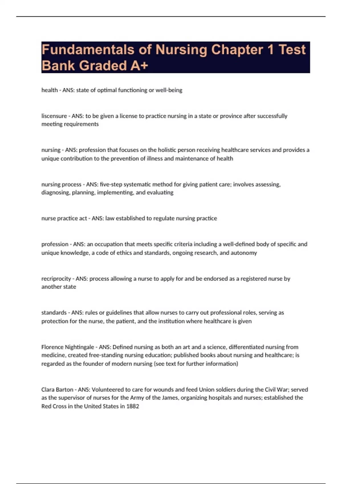 Fundamentals of Nursing Chapter 1 Test Bank Graded A+