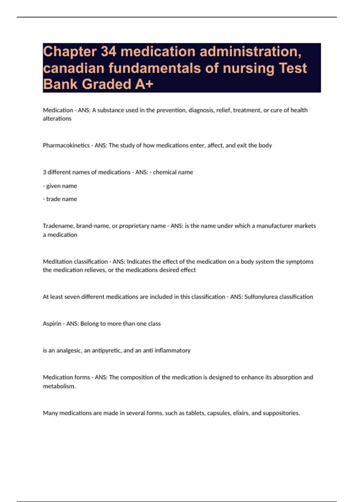 Chapter 34 medication administration, canadian fundamentals of nursing Test Bank Graded A+.