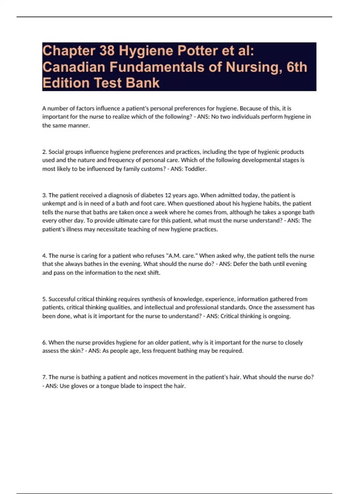 Chapter 38 Hygiene Potter et al Canadian Fundamentals of Nursing, 6th Edition Test Bank