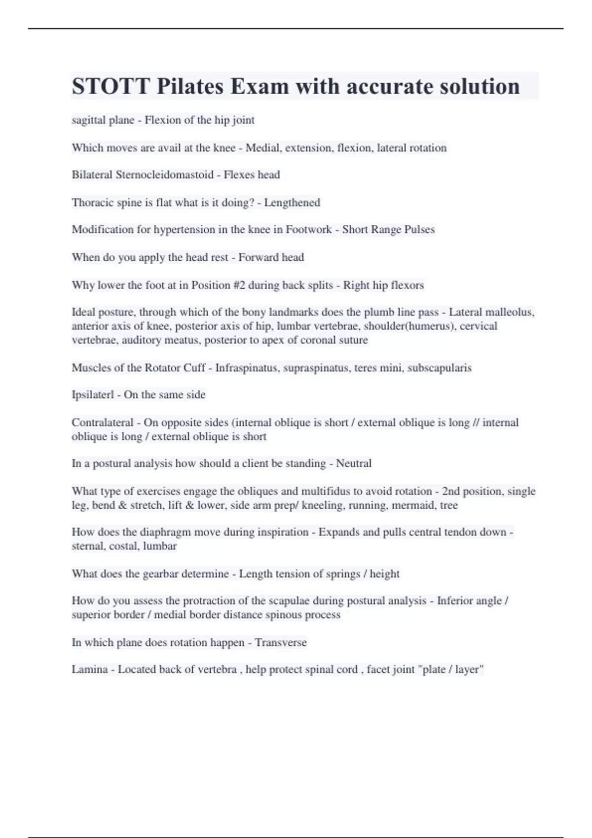 STOTT Pilates Exam with accurate solution sagittal plane - Flexion of the hip joint Which moves are avail at the knee - Medial, extension, flexion, lateral rotation Bilateral Sternocleidomastoid - Flexes head Thoracic spine is flat what is it doing? - Lengthened Modification for hypertension in the knee in Footwork - Short Range Pulses When do you apply the head rest - Forward head Why lower the foot at in Position #2 during back splits - Right hip flexors Ideal posture, through which of the bony landmarks does the plumb line pass - Lateral malleolus, anterior axis of knee, posterior axis of hip, lumbar vertebrae, shoulder(humerus), cervical vertebrae, auditory meatus, posterior to apex of coronal suture Muscles of the Rotator Cuff - Infraspinatus, supraspinatus, teres mini, subscapularis Ipsilaterl - On the same side Contralateral - On opposite sides (internal oblique is short / external oblique is long // internal oblique is long / external oblique is short In a postural analysis how should a client be standing - Neutral What type of exercises engage the obliques and multifidus to avoid rotation - 2nd position, single leg, bend & stretch, lift & lower, side arm prep/ kneeling, running, mermaid, tree How does the diaphragm move during inspiration - Expands and pulls central tendon down - sternal, costal, lumbar What does the gearbar determine - Length tension of springs / height How do you assess the protraction of the scapulae during postural analysis - Inferior angle / superior border / medial border distance spinous process In which plane does rotation happen - Transverse Lamina - Located back of vertebra , help protect spinal cord , facet joint "plate / layer" How does the shoulder joint move during Arms Pulling Straps #2 - Latissimus / teres major concentric addiction , mid / posterior deltoids keep at constant height What does winging scapulae mean - Protrudes