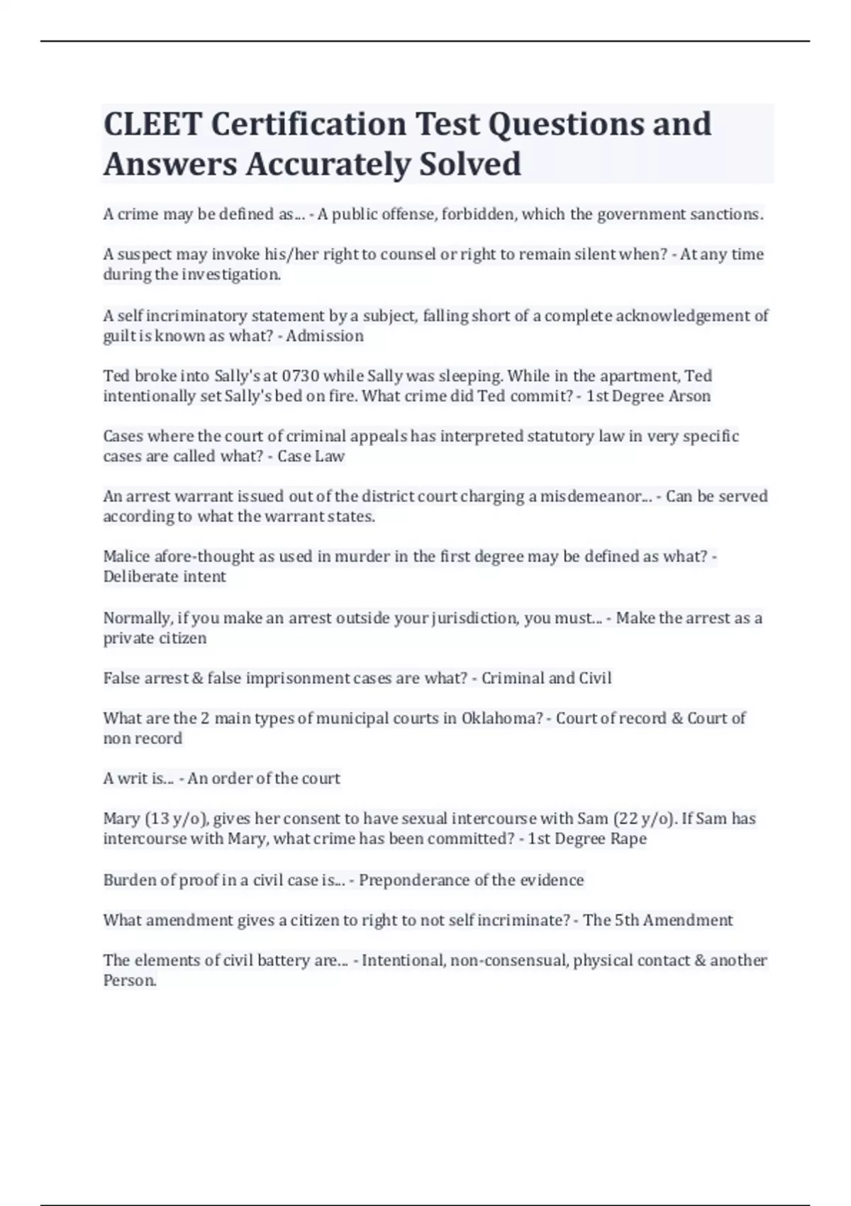 CLEET Certification Test Questions and Answers Accurately Solved A crime may be defined as... - A public offense, forbidden, which the government sanctions. A suspect may invoke his/her right to counsel or right to remain silent when? - At any time during the investigation. A self incriminatory statement by a subject, falling short of a complete acknowledgement of guilt is known as what? - Admission Ted broke into Sally's at 0730 while Sally was sleeping. While in the apartment, Ted intentionally set Sally's bed on fire. What crime did Ted commit? - 1st Degree Arson Cases where the court of criminal appeals has interpreted statutory law in very specific cases are called what? - Case Law An arrest warrant issued out of the district court charging a misdemeanor... - Can be served according to what the warrant states. Malice afore-thought as used in murder in the first degree may be defined as what? - Deliberate intent Normally, if you make an arrest outside your jurisdiction, you must... - Make the arrest as a private citizen False arrest & false imprisonment cases are what? - Criminal and Civil What are the 2 main types of municipal courts in Oklahoma? - Court of record & Court of non record A writ is... - An order of the court Mary (13 y/o), gives her consent to have sexual intercourse with Sam (22 y/o). If Sam has intercourse with Mary, what crime has been committed? - 1st Degree Rape Burden of proof in a civil case is... - Preponderance of the evidence What amendment gives a citizen to right to not self incriminate? - The 5th Amendment The elements of civil battery are... - Intentional, non-consensual, physical contact & another Person. The rights to an attorney during a police interrogation or when defendants are in custodial situations are defined in what Case Law? - Miranda v. Arizona Generally, a police officer may arrest for a misdemeanor? - Committed or attempted in his presence Improper service, improper venue, lack of jurisdiction, and statute of limitations are examples of... - Technical defenses of a constitutional tort Reasonable grounds such as would warrant a prudent person to believe certain facts are true is what? - Probable Cause Failure to exercise the necessary degree of care where a reasonable person would use under a given set of circumstances is what? - Negligence The legal steps necessary to provide a violation of a criminal statute is known as... - Elements of a crime Homicide is justifiable when? - When defending against deadly force A good rule concerning the use of force by a LEO is what? - Use force when it is necessary and then use only reasonable force. Under conditions specified in 21 O.S. 540B, a person commits a felony by running a roadblock. Under these conditions, what may an officer do? - Use deadly force if the person poses a threat of deadly force to the officer or another person. Sam is in his house sitting on the couch in the living room when you tell him that he is under arrest. Where/What can you search? - Sam and the Couch You have reason to search a motel room rented by an individual for a period of 5 days. It is currently day 2 of the rental facility. The individual is not available to give consent. What must you do? - Seek a search warrant An affidavit must describe the person or place to be searched... - So precisely that it excludes all other persons or places A search warrant must be executed and returned to the issuing magistrate within what? - 10 days You are unable to appear to the magistrate to personally give a testimony & present your affidavit to the court to receive a search warrant. The statutes allow? - The magistrate to authorize you to sign their name. You are compelled to search a certain apartment which is known to be rented by Sam. You realize that you do not have enough PC to get a warrant. You decide to seek permission to search. The person who can give consent is who? - The lessee The Carroll Doctrine is a rule permitting searches of cars, boats, or aircraft without a search warrant, if what 3 conditions are present? - Evidence is mobile/have PC/ No time for warrant Mere suspicion or hunch allows the officer to? - Start an investigation Hearsay is? - Second hand information Direct evidence - Requires no interference to be drawn in order to reach a conclusion For evidence to be admissible it must be? - Factual & Material Searches & seizures conducted outside the judicial process without prior approval by a judge are "per se" unreasonable - Under the 4th Amendment subject to a few specifically established & well delineated exceptions. The reason a frisk is condoned by the court is? - For LEO protection The legal basis or a "Stop & Frisk" is? - Terry V. Ohio You have reasonable suspicion to believe that Sam is distributing cocaine from his car. You approach the car. Sam is sitting in the drier seat. You direct Sam out of the car and immediately conduct a "pat-down". You do not find a weapon on Sam, but you feel a rock hard object in Sam's sock. Based on your training & experience, you know the object is crack cocaine. This evidence what? - Admissible because the search is reasonable & you can reasonably articulate how you knew it was crack cocaine. Sam was convicted at 18 for Burglary in the 1st degree. Sam was certified to receive an adult sentence & was admitted to a deferred sentence. You have arrested Sam for misdemeanor A&B. How will Sam will be tried? - As an adult For purposes of abuse or neglect, Oklahoma defines a child as; - Anyone under 18 years of age Sam has been charged robbery with a FA. Sam is 15yrs old. Under Oklahoma law he is considered? - A youthful offender Which of the following guidelines for interrogating a juvenile is applicable if the info gained is to be admissible into evidence against the juvenile? - Allow the juvenile & parent a private session prior to the interrogation You suspect a delinquent of a felony crime and/or being an escapee, the child may be held in a certified jail not to exceed? 