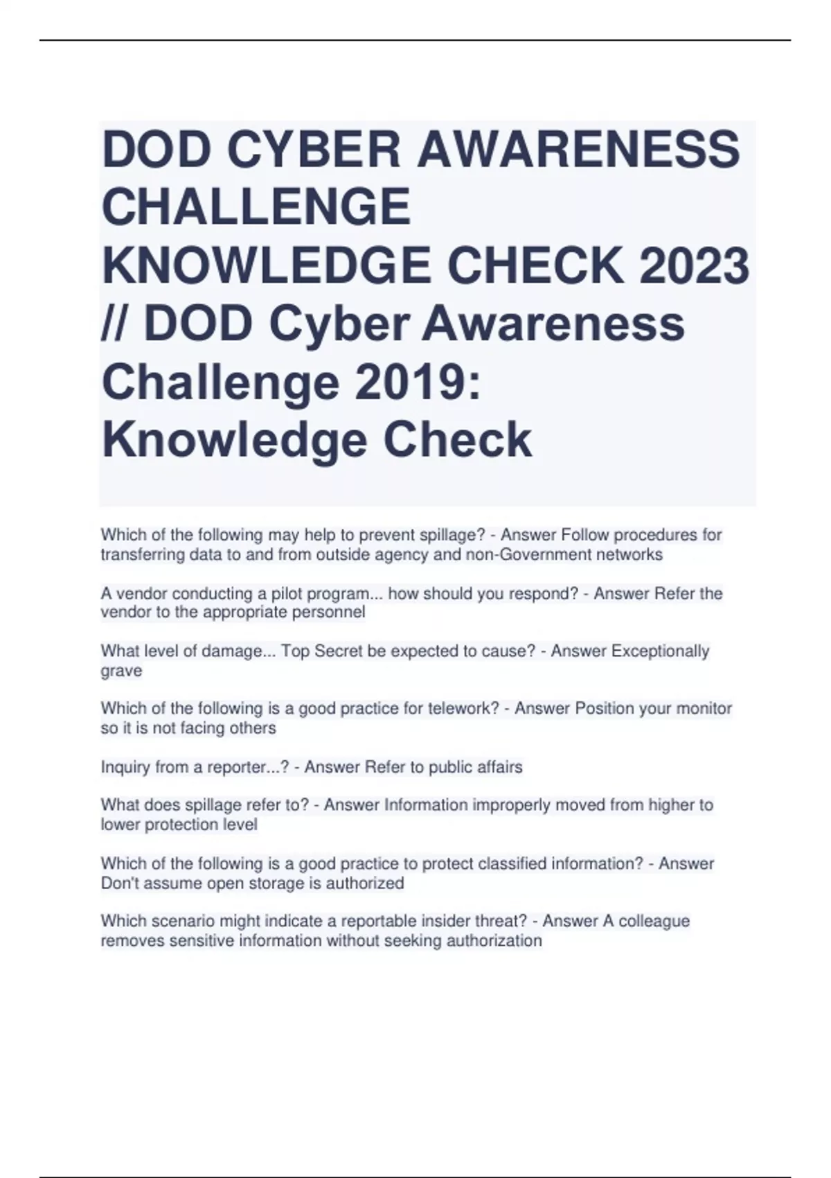 DOD CYBER AWARENESS CHALLENGE KNOWLEDGE CHECK 2023 // DOD Cyber Awareness Challenge 2019: Knowledge Check Which of the following may help to prevent spillage? - Answer Follow procedures for transferring data to and from outside agency and non-Government networks A vendor conducting a pilot program... how should you respond? - Answer Refer the vendor to the appropriate personnel What level of damage... Top Secret be expected to cause? - Answer Exceptionally grave Which of the following is a good practice for telework? - Answer Position your monitor so it is not facing others Inquiry from a reporter...? - Answer Refer to public affairs What does spillage refer to? - Answer Information improperly moved from higher to lower protection level Which of the following is a good practice to protect classified information? - Answer Don't assume open storage is authorized Which scenario might indicate a reportable insider threat? - Answer A colleague removes sensitive information without seeking authorization Which of the following is a reportable insider threat activity? - Answer Attempting to access sensitive information without need to know What function do Insider Threat Programs aim to fulfill? - Answer Proactively identify potential threats and formulate yadayadayada How can you protect your organization on social networking sites? - Answer Ensure there are no identifiable landmarks visible in photos What piece of information is safest to include on your social media profile? - Answer If you don't know the answer to this one, please do the training in full. you're dumb forreal. Which of the following is a security best practice when using social networking sites? - Answer Avoiding posting your mother's maiden name Which of the following statements is true? - Answer Many apps and smart devices collect and share your personal information and contribute..... Which of the following statements is true? - Answer Adversaries exploit social networking sites to disseminate fake news. A trusted friend in your social network posts vacc