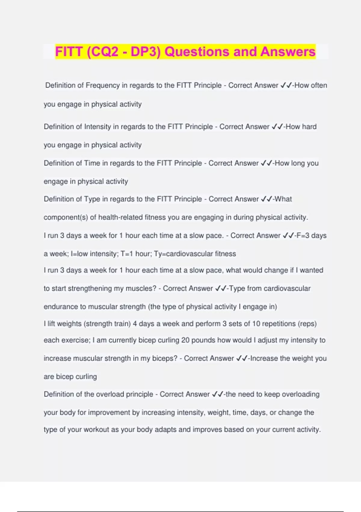 FITT (CQ2 - DP3) Questions and Answers Definition of Frequency in regards to the FITT Principle - Correct Answer ️️ -How often you engage in physical activity Definition of Intensity in regards to the FITT Principle - Correct Answer ️️ -How hard you engage in physical activity Definition of Time in regards to the FITT Principle - Correct Answer ️️ -How long you engage in physical activity