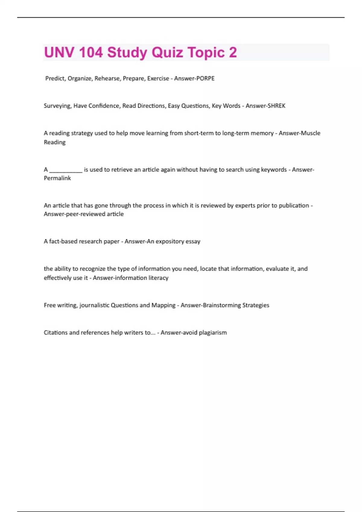 Predict, Organize, Rehearse, Prepare, Exercise - Answer-PORPE Surveying, Have Confidence, Read Directions, Easy Questions, Key Words - Answer-SHREK A reading strategy used to help move learning from short-term to long-term memory - Answer-Muscle Reading A __________ is used to retrieve an article again without having to search using keywords - AnswerPermalink An article that has gone through the process in which it is reviewed by experts prior to publication - Answer-peer-reviewed article A fact-based research paper - Answer-An expository essay the ability to recognize the type of information you need, locate that information, evaluate it, and effectively use it - Answer-information literacy Free writing, journalistic Questions and Mapping - Answer-Brainstorming Strategies Citations and references help writers to... - Answer-avoid plagiarism